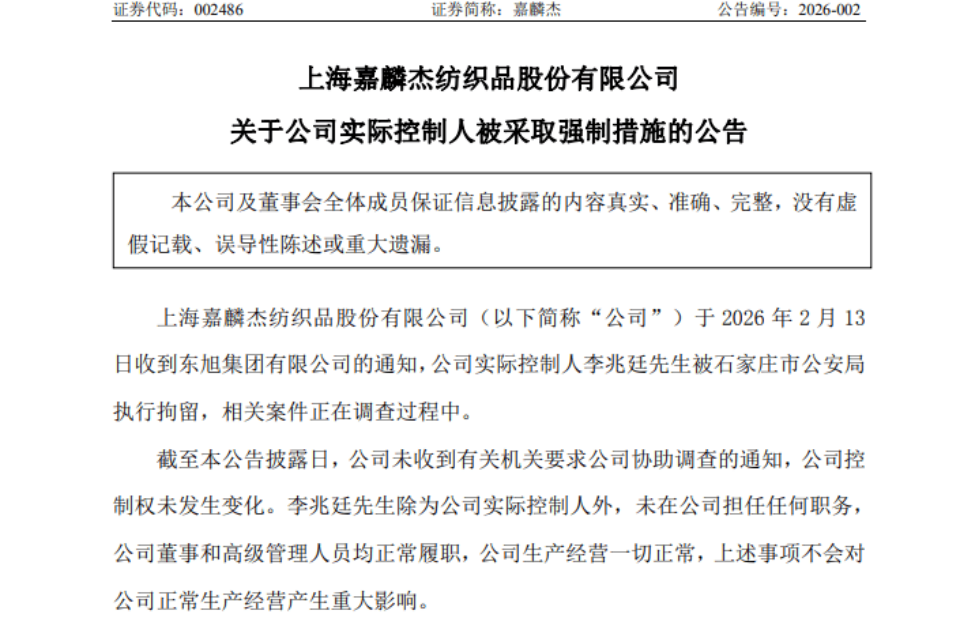 2月13日晚间,上市公司嘉麟杰公告称:公司实际控制人李兆廷被石家庄市公安局执行拘留,相关案件正在调查过程中。
