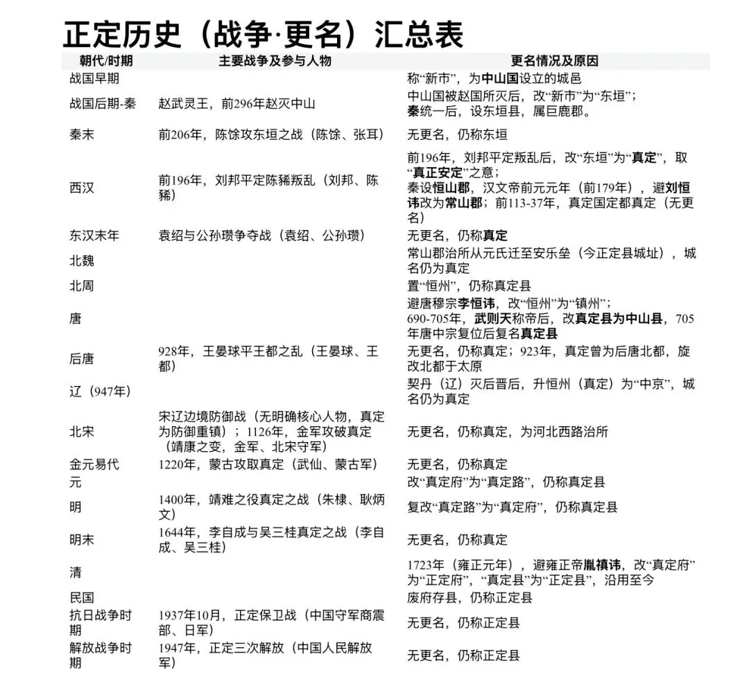 5.后续演变:秦代东垣为恒山郡郡治;西汉刘邦改东垣为真定(取 "真正安定" 之意);明清避雍正讳改为正定,沿用至今。