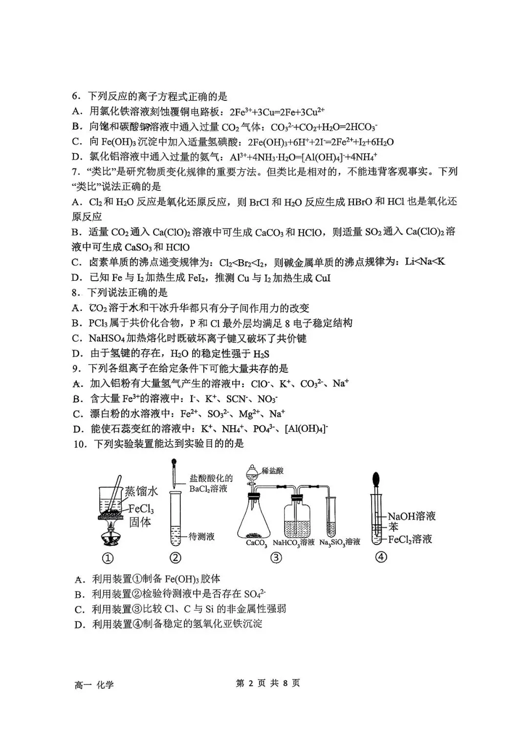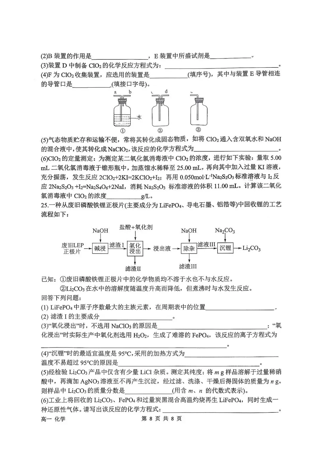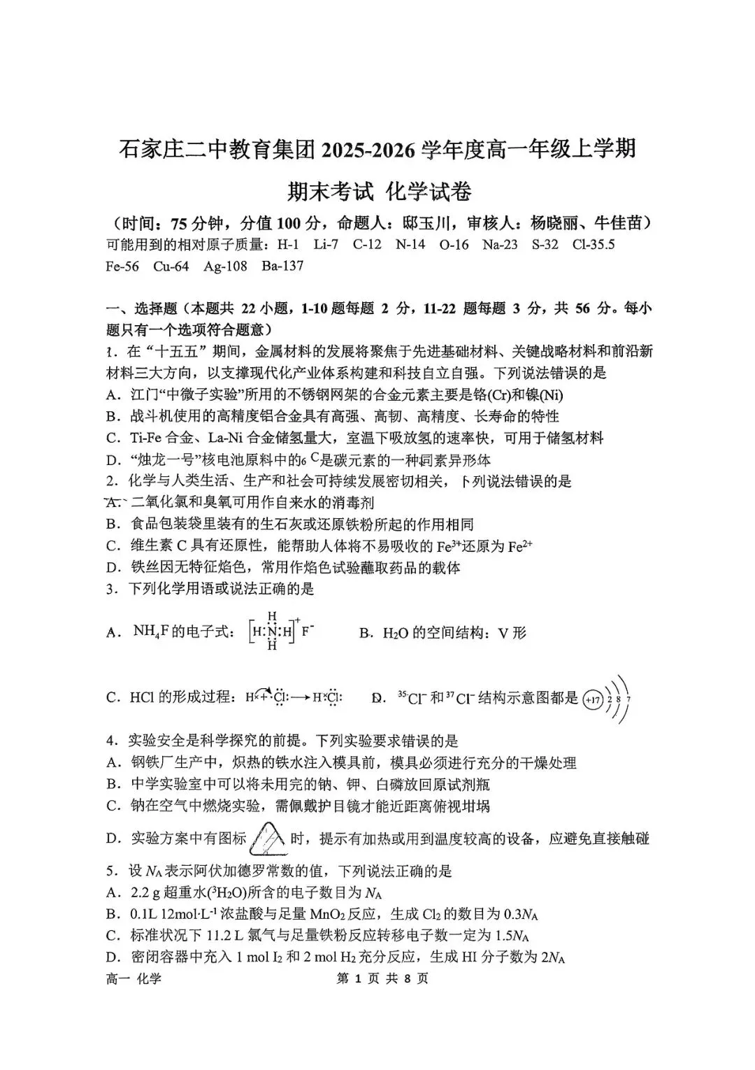石家庄二中25-26年高一上册期末化学真题