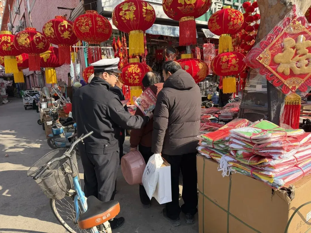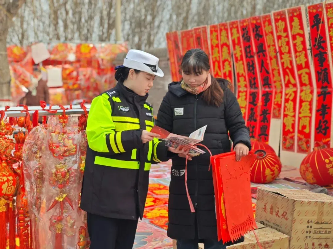 宣讲交警对正在采买对联的老乡说:“新年好,咱出门在外除了添年味,交通安全也得记心头,贴春联走亲访友,开车骑车都慢点开,系好安全带、戴好头盔,平平安安才是最好的新年福呀!”