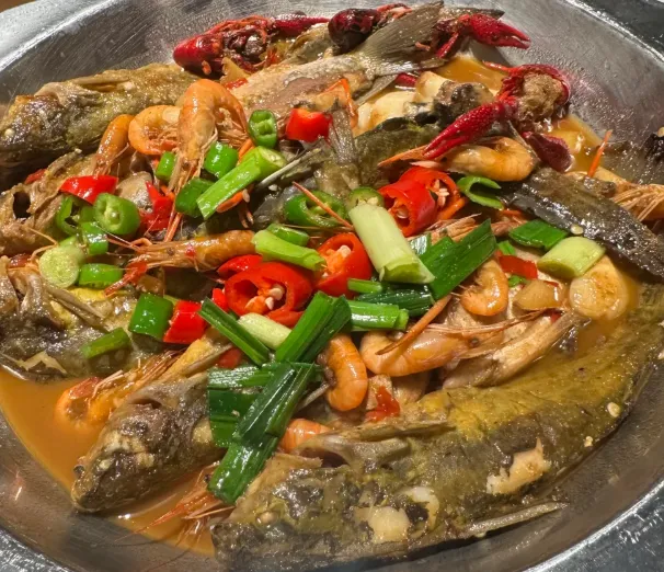 【铁锅炖杂鱼做法简述】大铁锅烧热,下猪油,葱姜蒜爆香,把刚打上来的鲫鱼、黑鱼、嘎鱼一股脑倒进去。不加太多佐料,就是酱油、大酱和水,咕嘟咕嘟慢炖。最绝的是要在锅边贴上一圈玉米面饼子(贴饼子),一半焦脆,一半浸满了鱼汤,咬一口,那是真香。