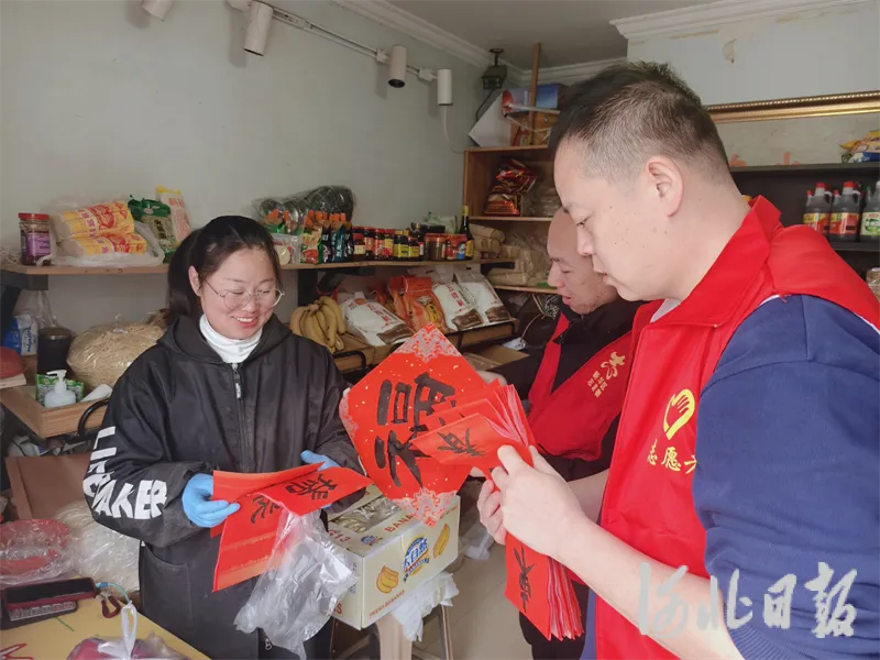河北日报客户端讯(李鹏茹)近日,石家庄市新华区天苑街道行政综合服务大厅的志愿者深入辖区商业街区、农贸市场、超市门店,开展“迎新春·送春联·倡诚信”宣传活动,将饱含祝福的手写春联与精准实用的诚信经营政策送到商户手中。