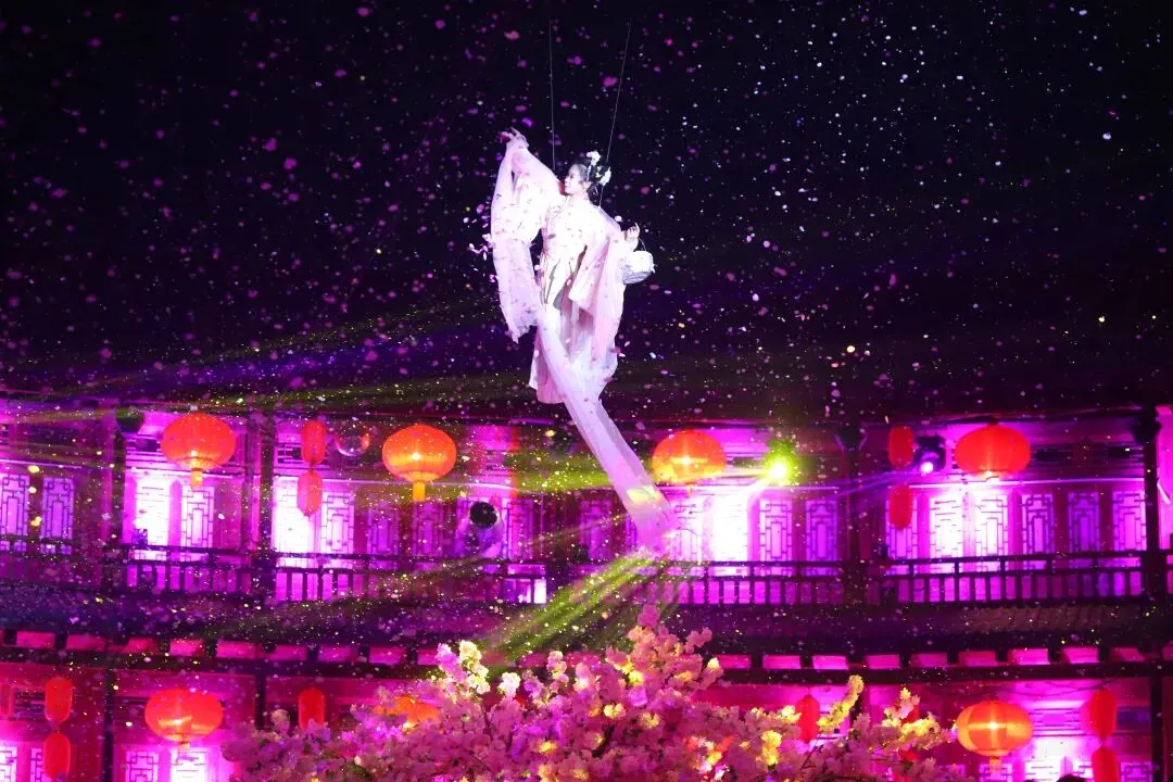 夜幕降临,江湖的浪漫与震撼才刚刚开始。17:55的主街区掌灯仪式,千人共举灯火,瞬间点亮整个江湖;18:00的《梦回长安》、18:35的《雪落长安》,一步一景皆是国风韵味,仿佛穿越千年盛世。
