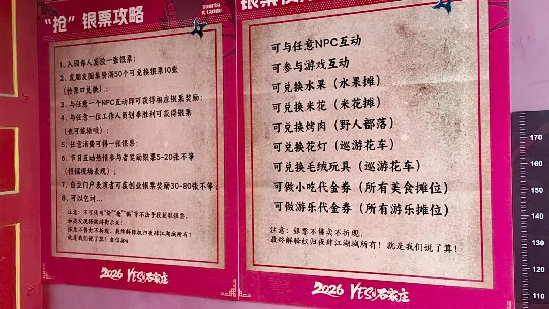 在这个江湖,“银票”就是通行凭证,万张银票等你来“抢”,解锁千种游戏玩法!入园即可获得一张银票,还有超多途径能轻松赢取:发朋友圈集赞50个可兑换10张;与任意NPC互动、和工作人员划拳胜利、园内任意消费,都能获得银票奖励;节目互动积极参与,还能赢取5-20张不等的银票,甚至自立门户表演,可获30-80张创业银票!