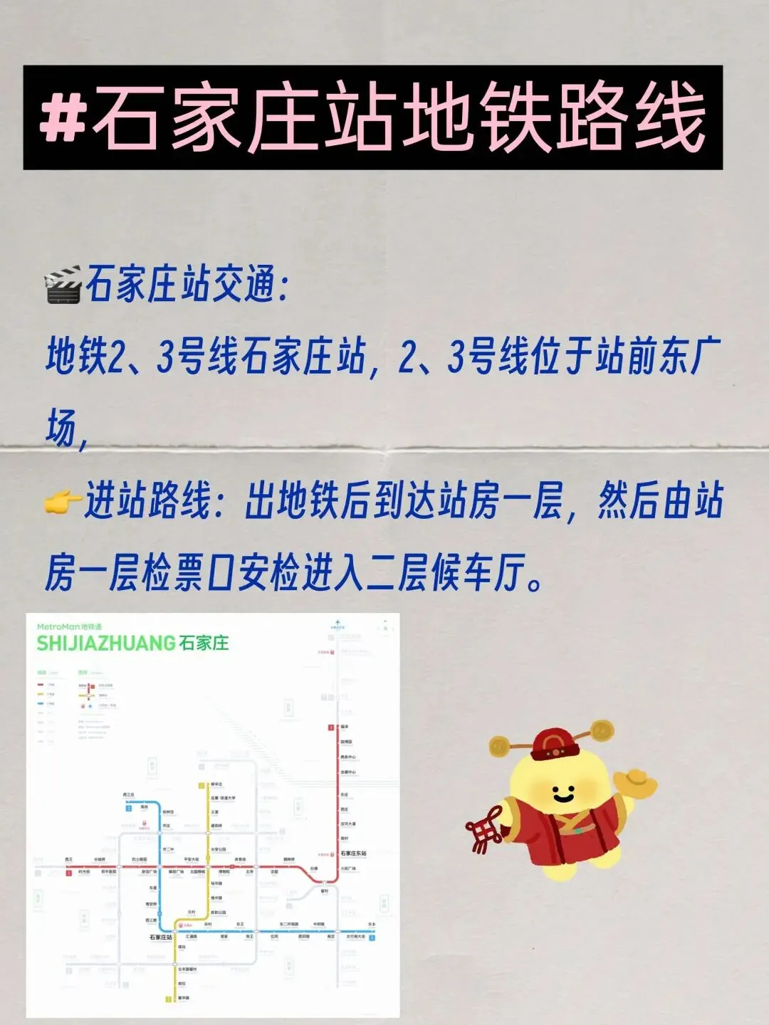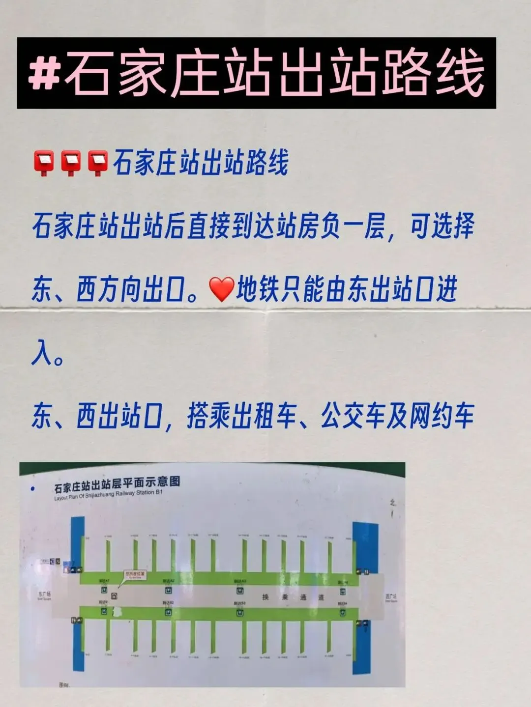 石家庄站出站后直接到达站房负一层,可选择东、西方向出口。❤️地铁只能由东出站口进入。