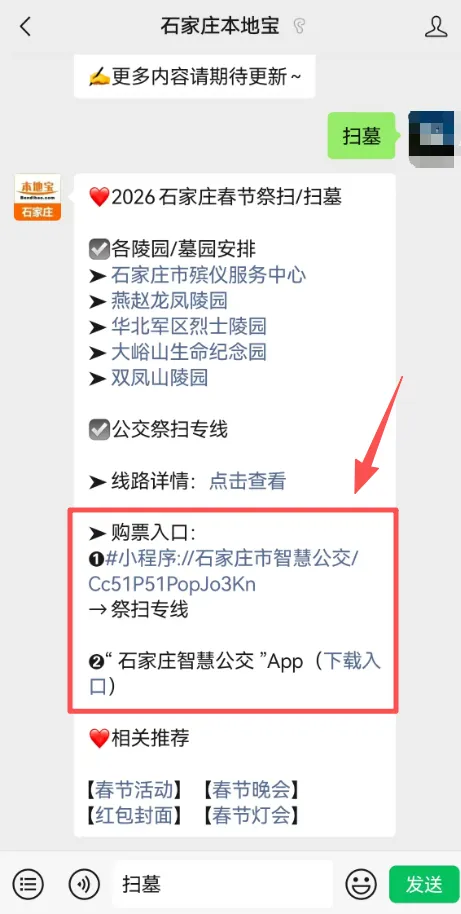 👉推荐服务:扫描或长按识别下方二维码,关注【石家庄本地宝】公众号,私信回复【祭扫】,即可获取购票入口。