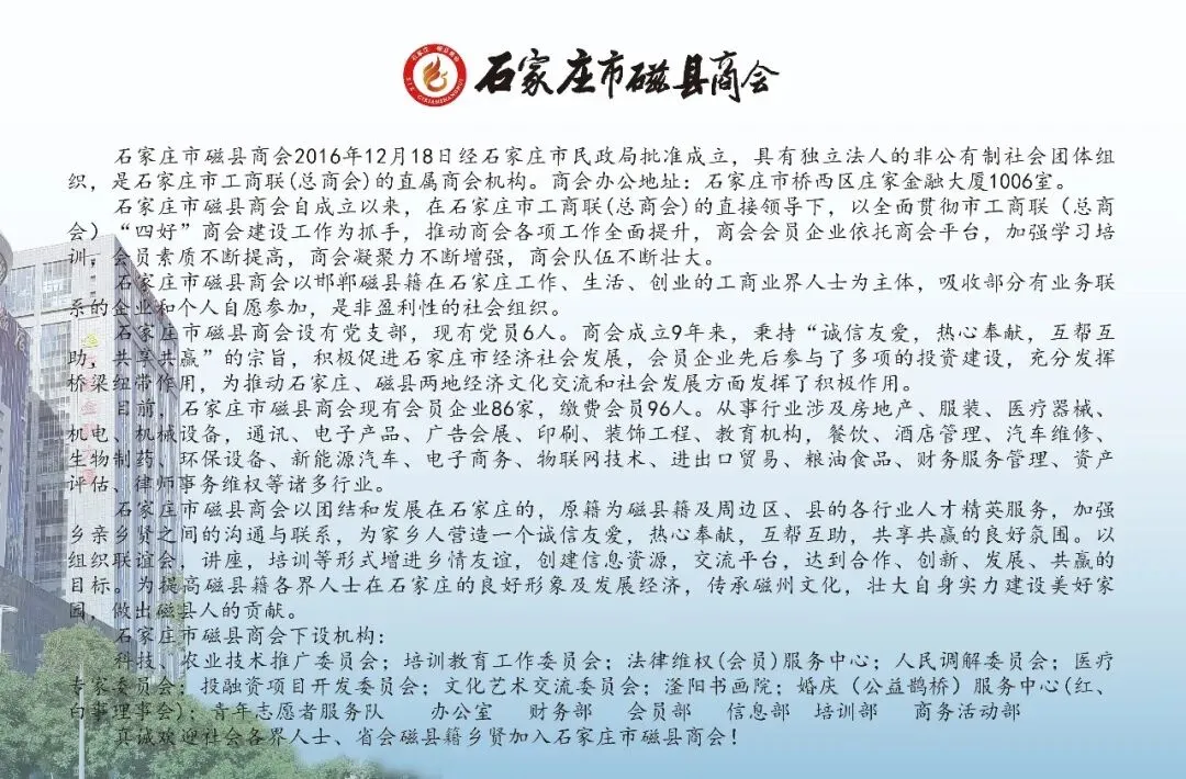 过去的一年里,在石家庄市工商联(总商会)的直接指导下,在商会会员企业的共同努力下,商会的各项工作取得了长足的发展和进步,商会积极搭建交流合作平台,使会员企业间相互促进、相互学习、相互交流,促进会员间的资源共享、优势互补、使会员企业在合作中实现了业务拓展与创新发展,给会员企业增强了活力;强化商会规范化建设能力,加强了商会党建工作水平。商会党支部积极组织广大党员参加市非公经济商协会党委组织的学习培训班,磁县商会党支部组织广大党员开展广泛的党日活动,营造浓厚的学习氛围,广大党员会员在企业中发挥模范带头作用,为企业的发展做出积极的贡献;发挥商会平台作用,积极做善事做好事儿。作为一个非营利性的社会组织,组织多次爱心捐助活动,大家积极伸出援爱之手,齐心协力,共同托举起爱心捐助的善举十分有意义。这一切成绩的背后,离不开每一位会长、理事会成员及广大会员的辛勤付出和无私奉献,使会员企业的担当与责任,让石家庄市磁县商会得以蓬勃发展。