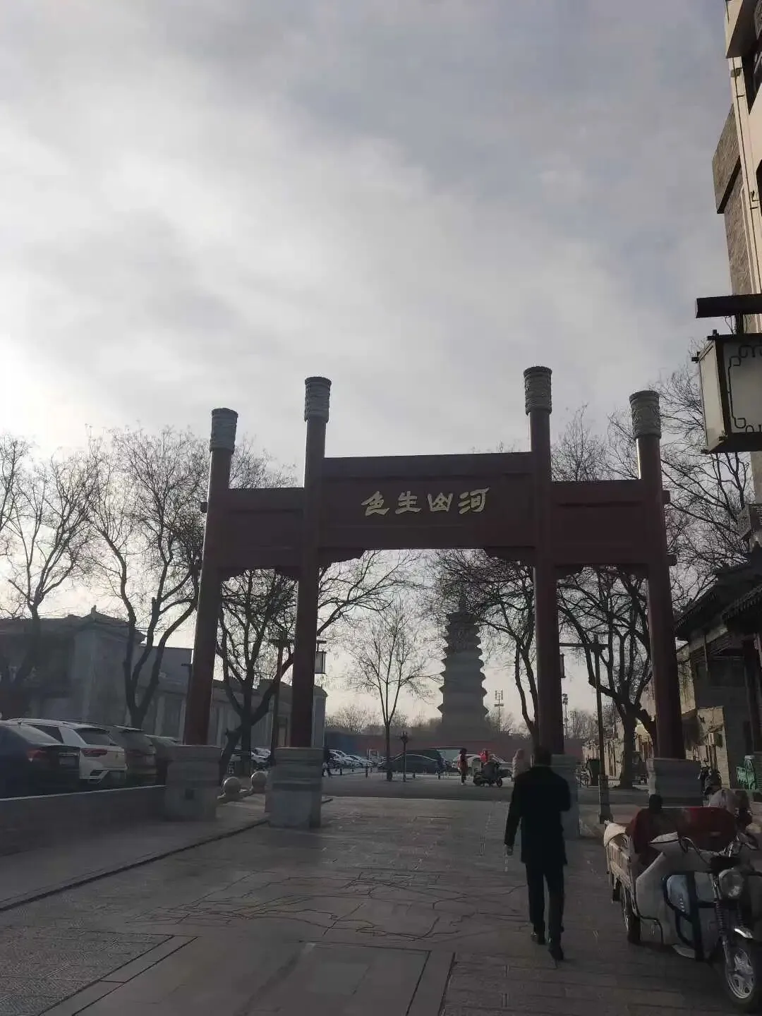 走过文庙、路过隆兴寺,文庙各地无异,蕴含着中国社会的秩序基因。而当我们走到一个写着“河山生色”的牌坊前,发现期待中的正定古城核心区就在眼前。问了几个当地人,明确就是正定古城,感觉风格却并不古。正定老乡也都笑笑说,正定古城就是这样,核心也就是几个被围着保护着的人文古迹,其实这也够了。古城四周店铺叫卖正定特产,或许是季节原因,古城内游客不多,宽街更显寂寞。