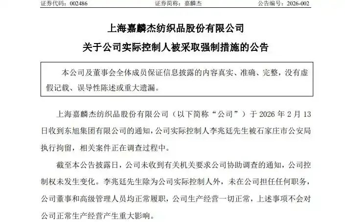 2月13日晚间,上海嘉麟杰纺织品股份有限公司(嘉麟杰,002486.SZ)突发公告披露,公司实际控制人李兆廷已于当日被石家庄市公安局执行拘留,相关案件正处于调查阶段。