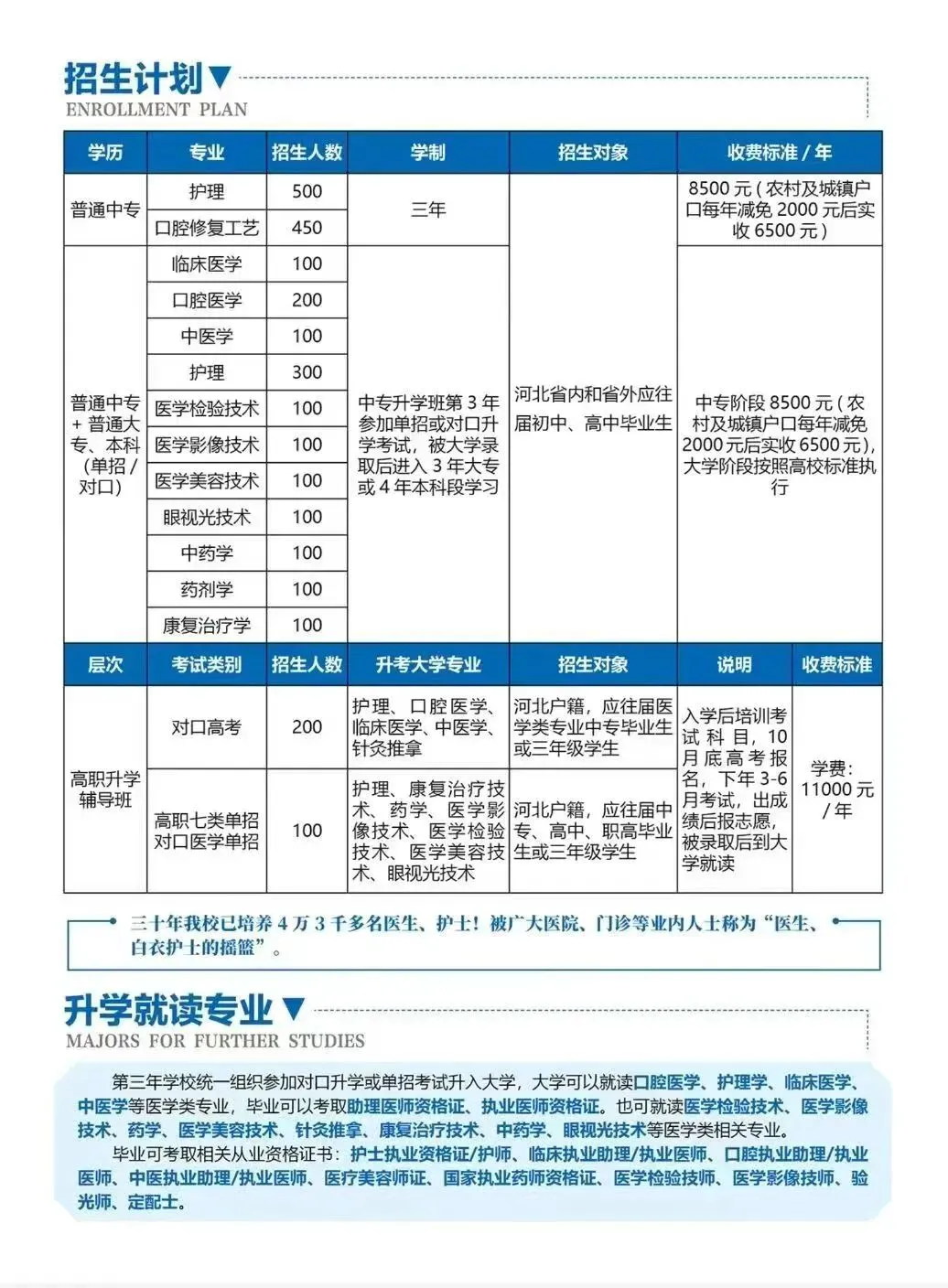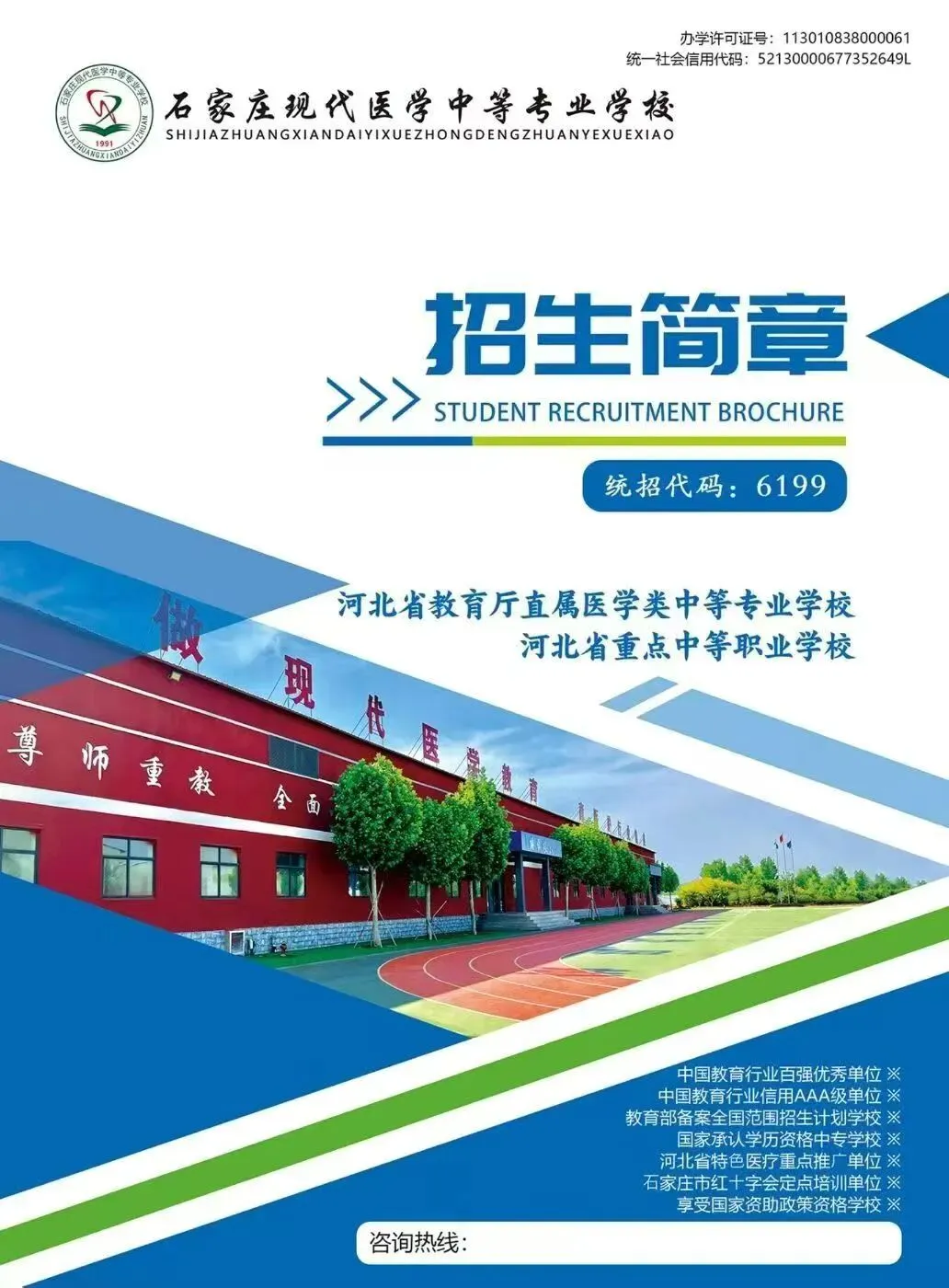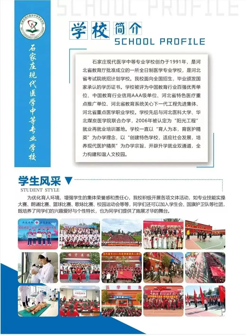 石家庄现代医学中等专业学校创办于1991年,是河北省教育厅批准成立的一所全日制医学专业学校,是河北省考试院统招计划学校。我校面向全国招生,毕业颁发国家承认的学历证书。学校被评为国家级重点口腔教育基地先进单位、河北省特色医疗重点推广单位河北省重点医学职业学校。学校先后与河北医科大学、华北煤炭医学院联合办学,2006年被认定为“阳光工程”就业再就业培训基地。