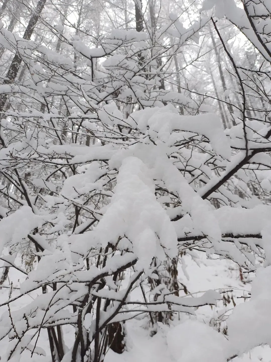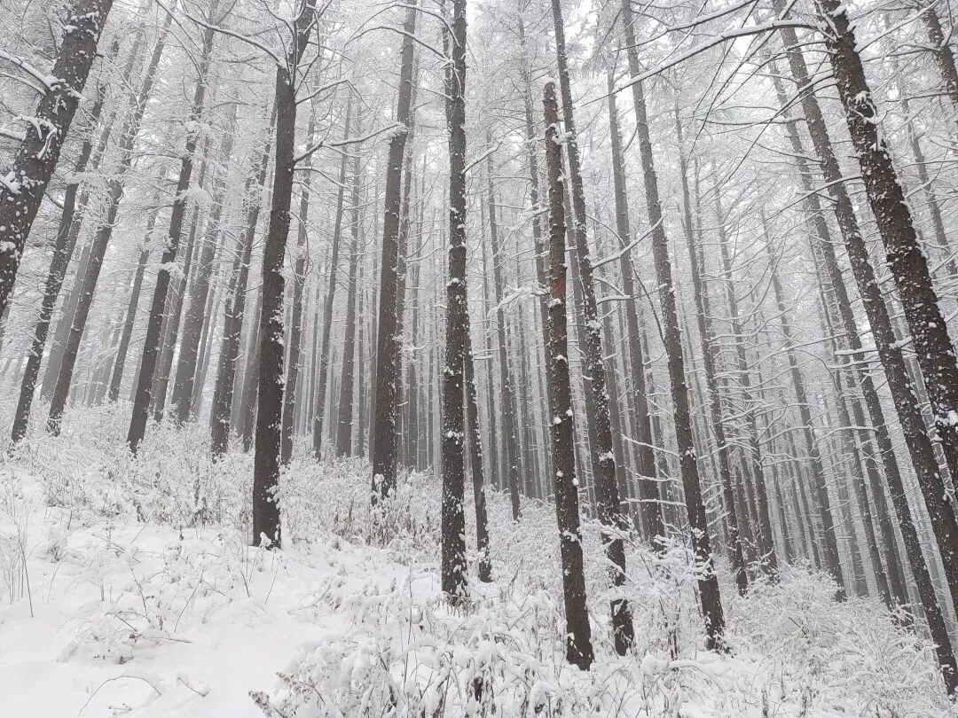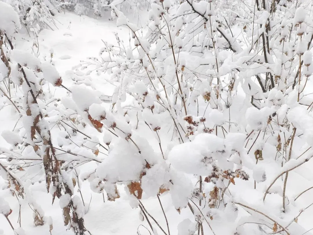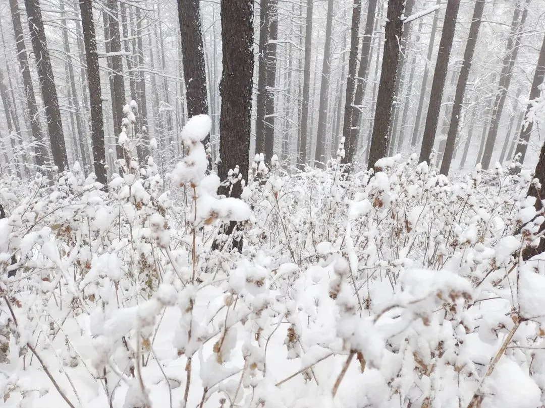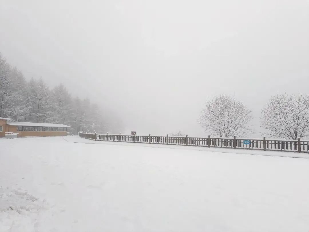 轻柔的小雪花飘飘洒洒,悄无声息地从空中落下来,落到屋顶、树上、草上、木栈道上,到天亮时雪大约有4寸厚,漫山遍野披上了一层洁白的冬装,使冬日的驼梁云顶更加宁静,仿佛一个万籁俱寂的童话世界。