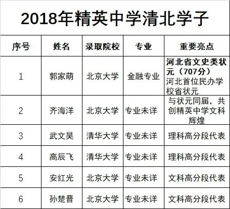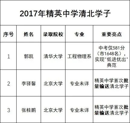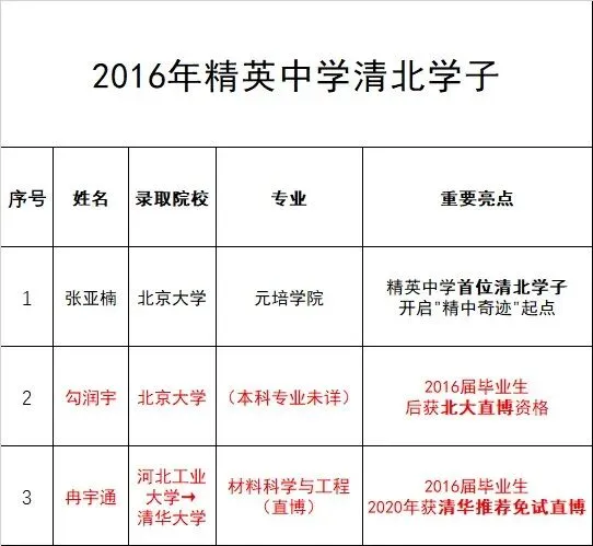 1、2016年实现清北录取"零突破",标志精英中学从薄弱校向名校跨越的起点。