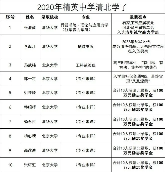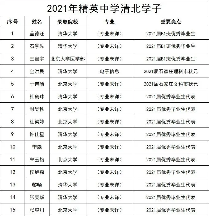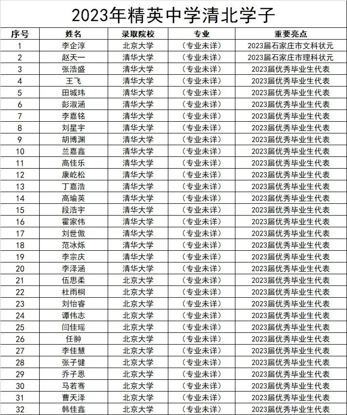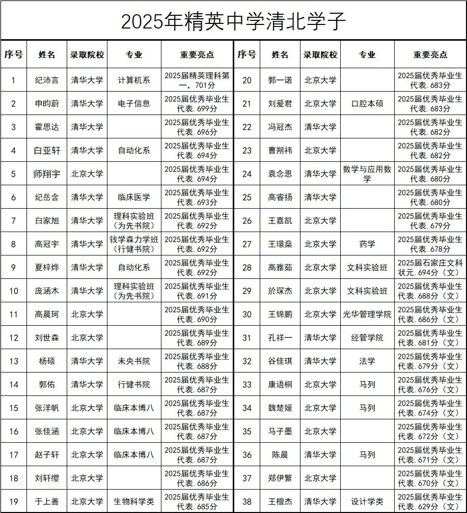 石家庄精英中学清北录取完整名单 (2016-2025)
