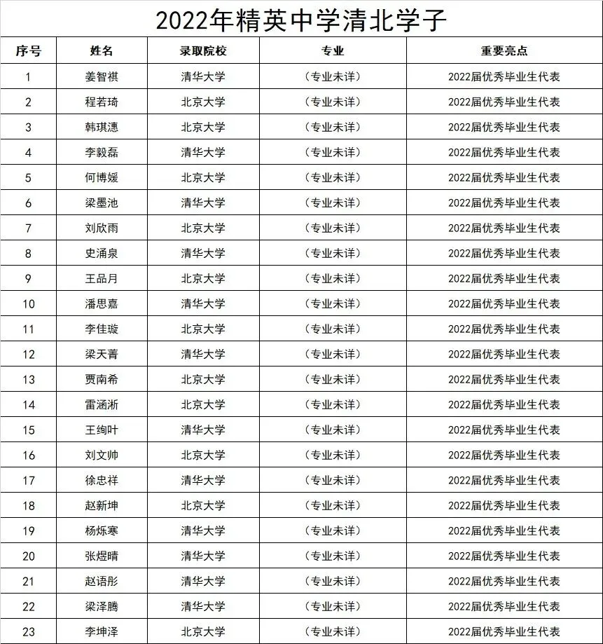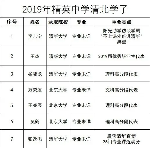 1.突破性发展:2012年时,精英中学应届一本上线人数仅4人,本一上线率1.44%;2016年实现清北零突破后,2019年本一上线率已飙升至93.6%,创造了教育界的"精中奇迹"。