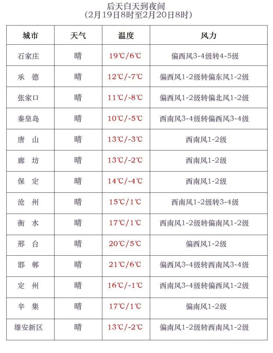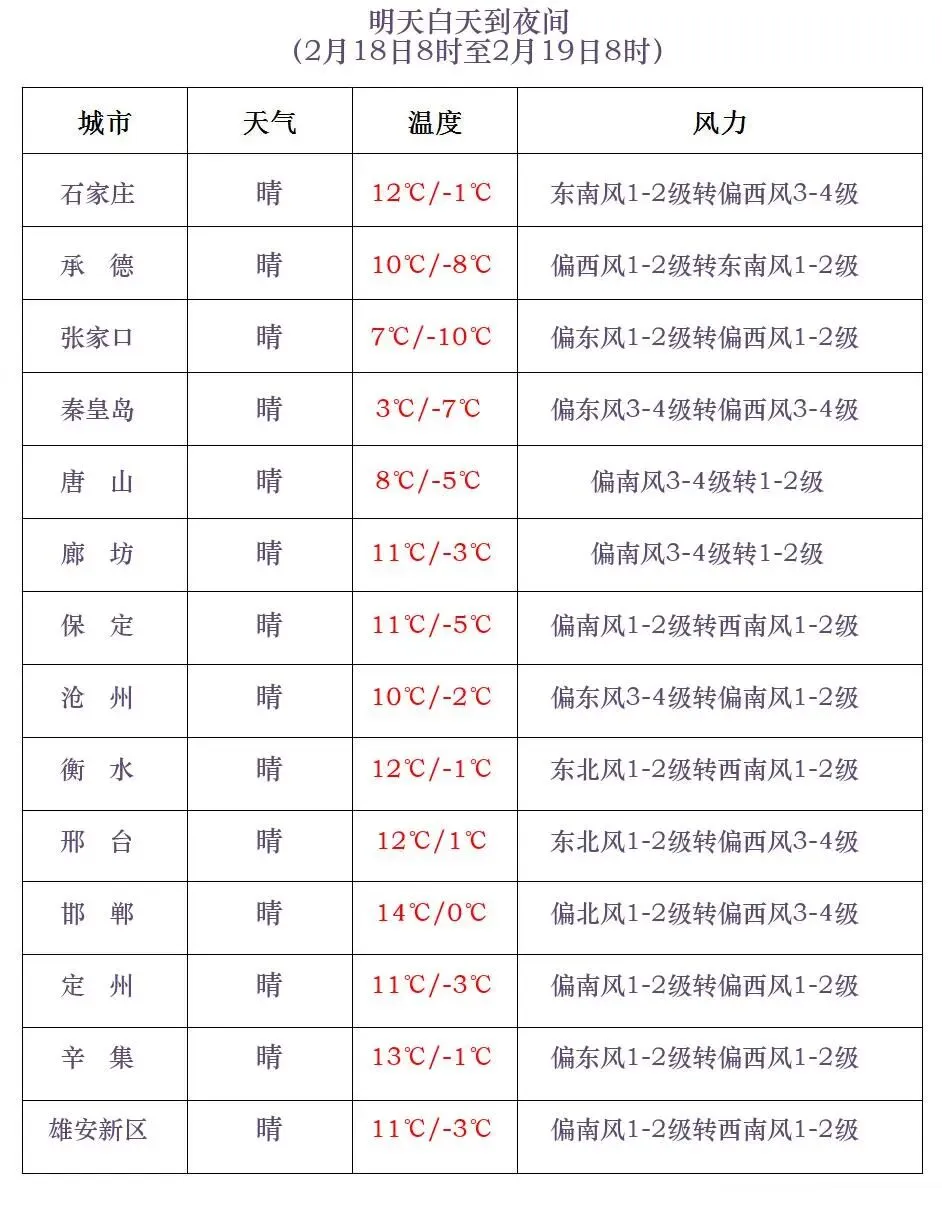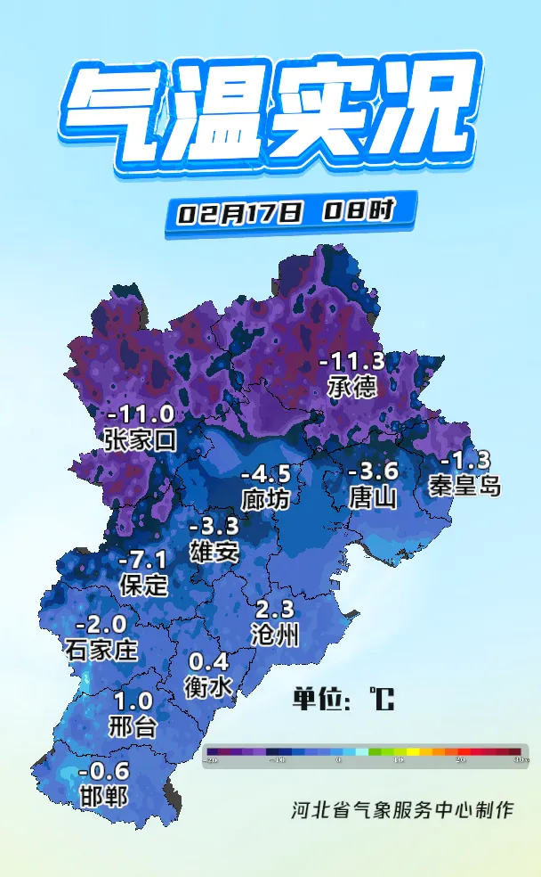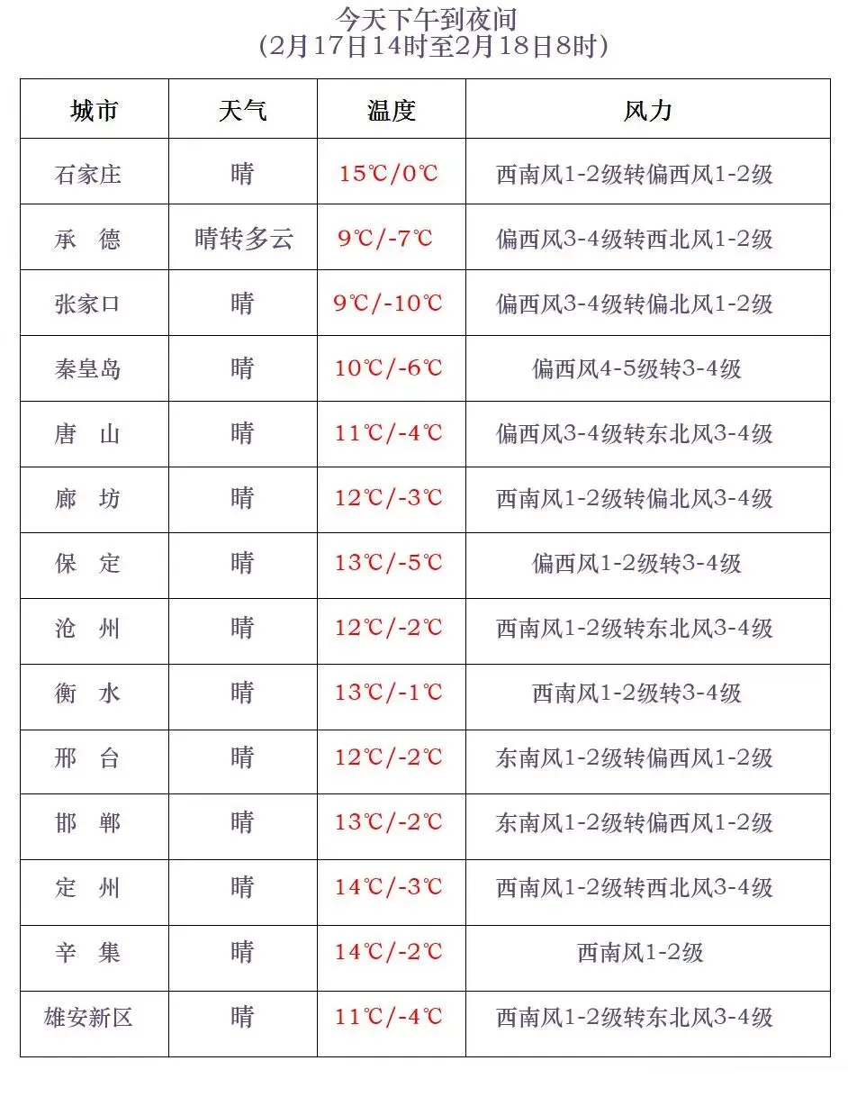 河北省气象台2026年2月17日11时发布天气预报:今天下午到夜间,张家口北部、承德北部多云转晴,其他地区晴间多云。