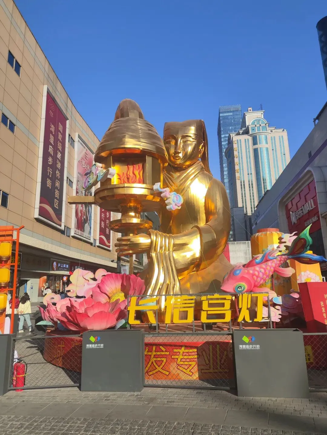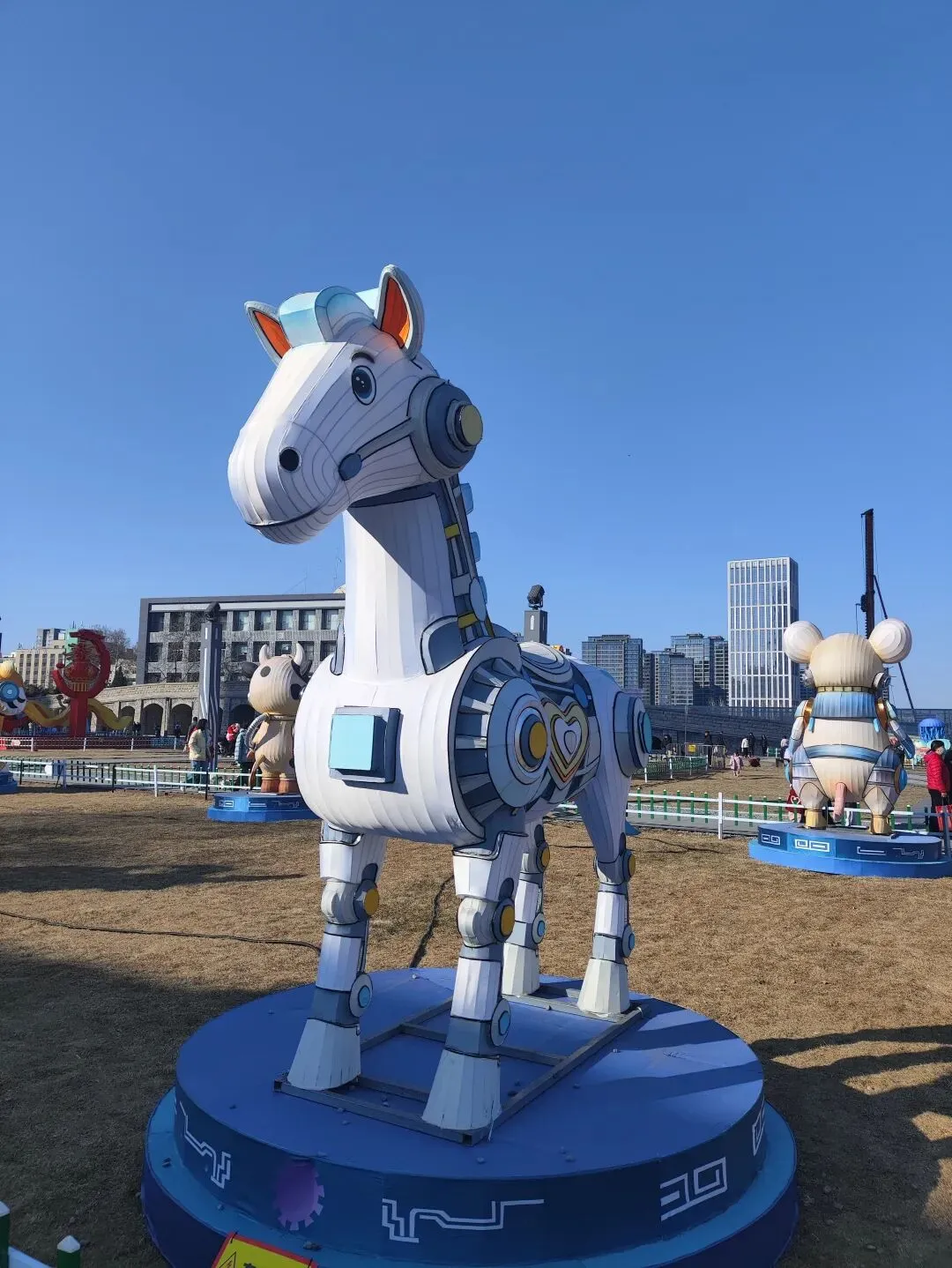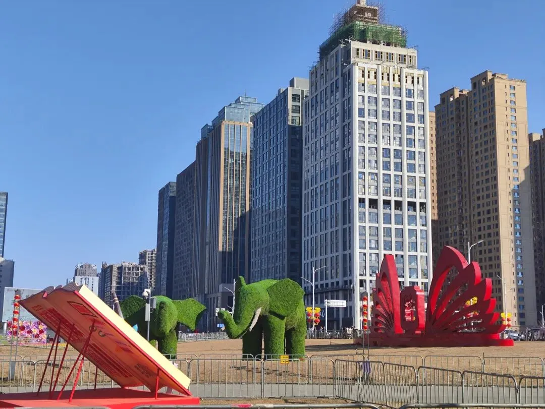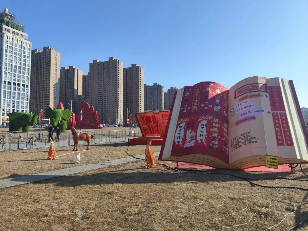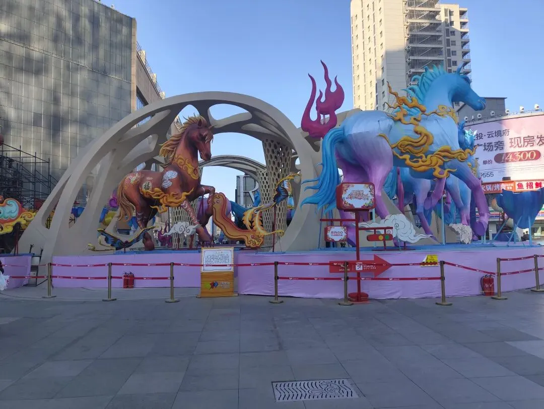 广场上摆放着各式造型的花灯和布景,晚上亮起来应该很漂亮。