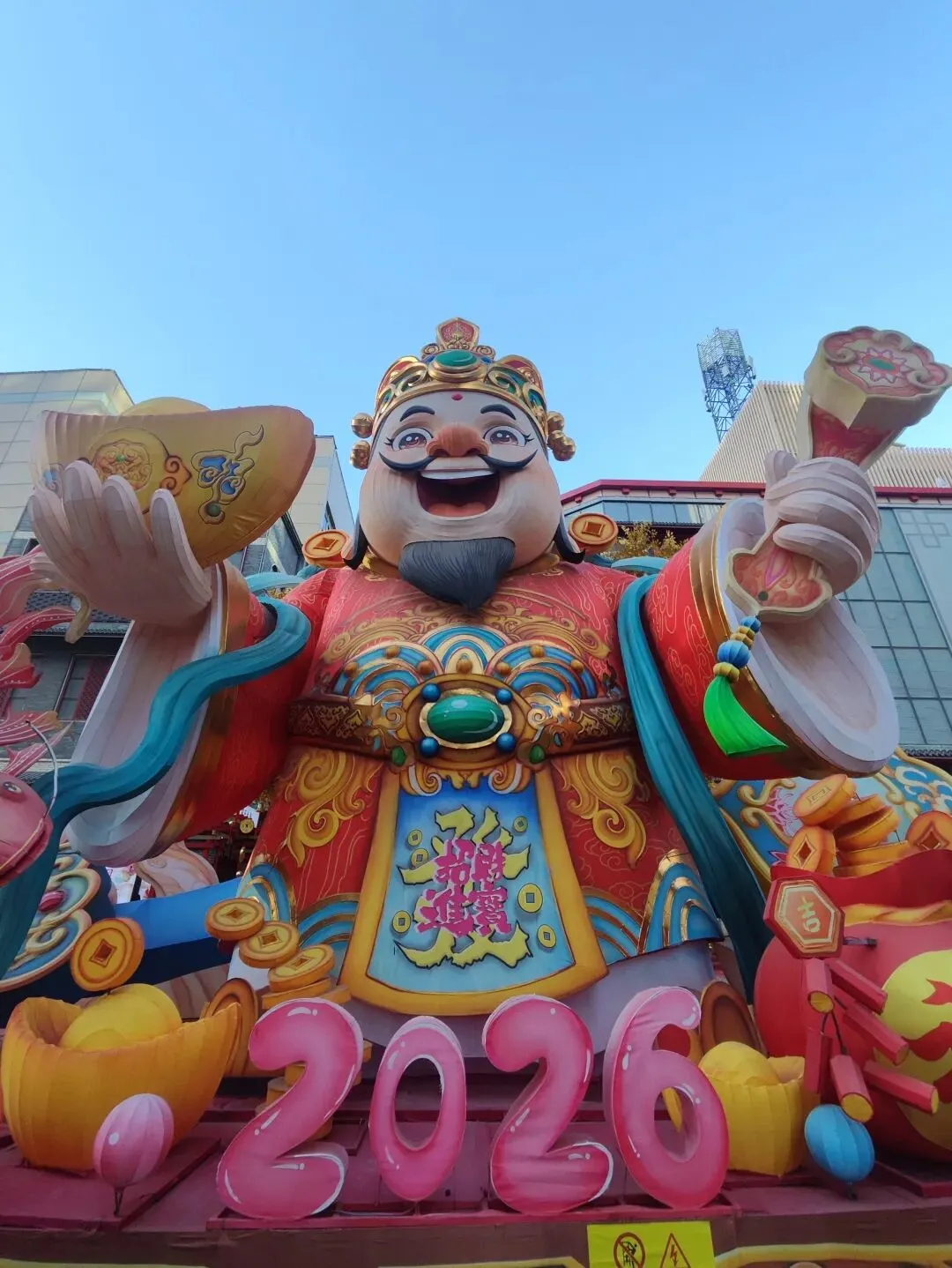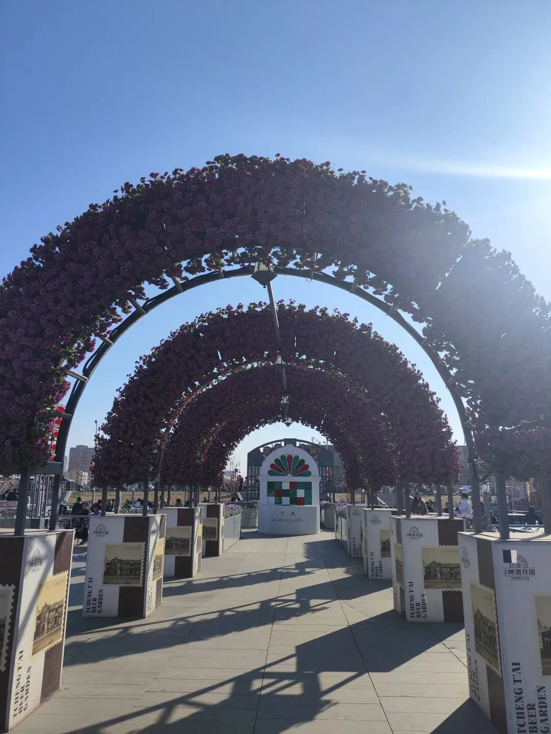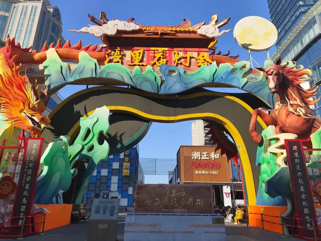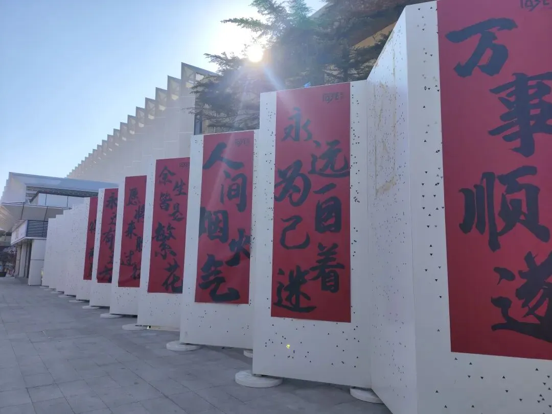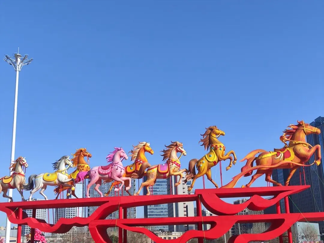 广场上摆放着各式造型的花灯和布景,晚上亮起来应该很漂亮。