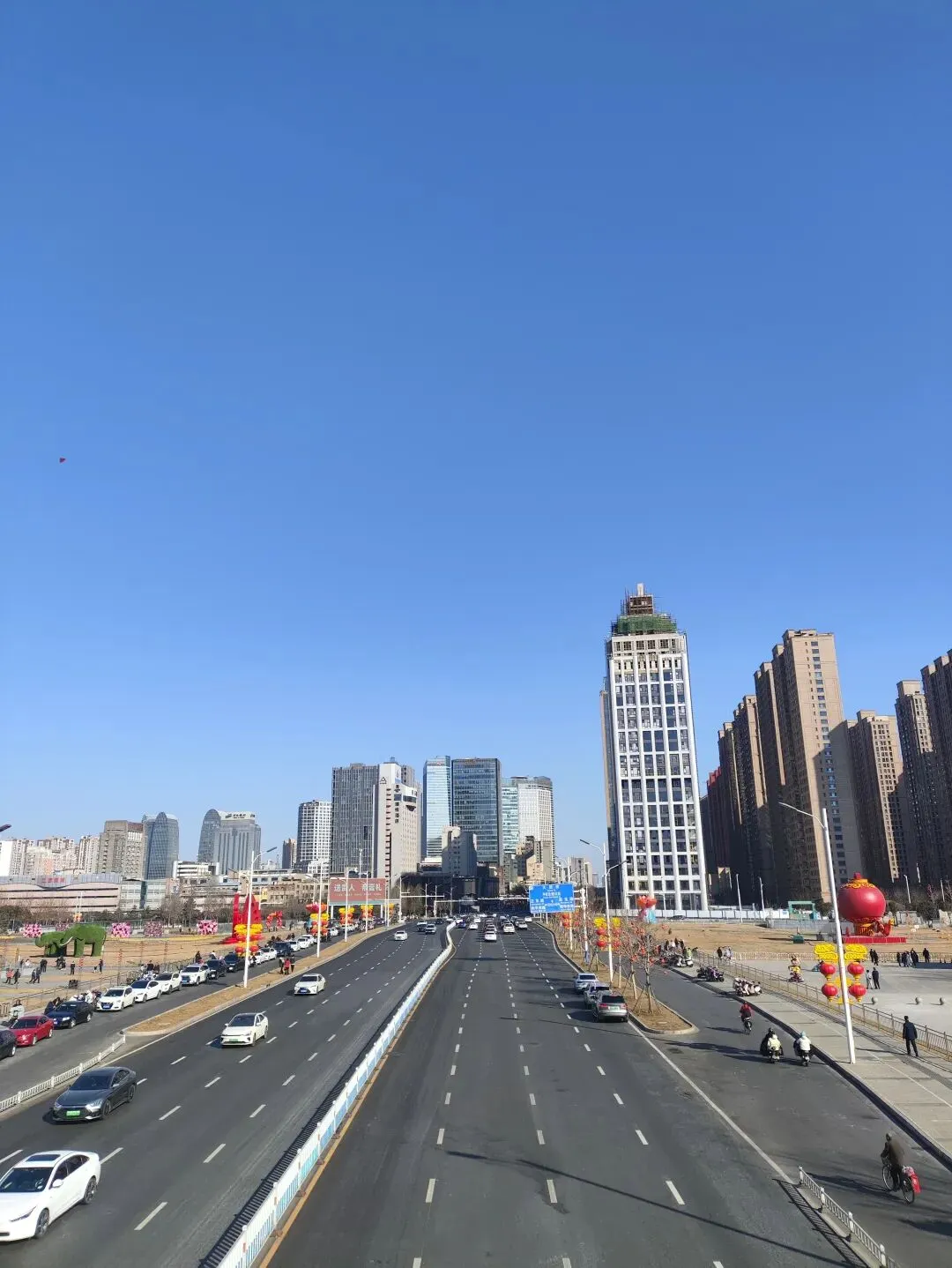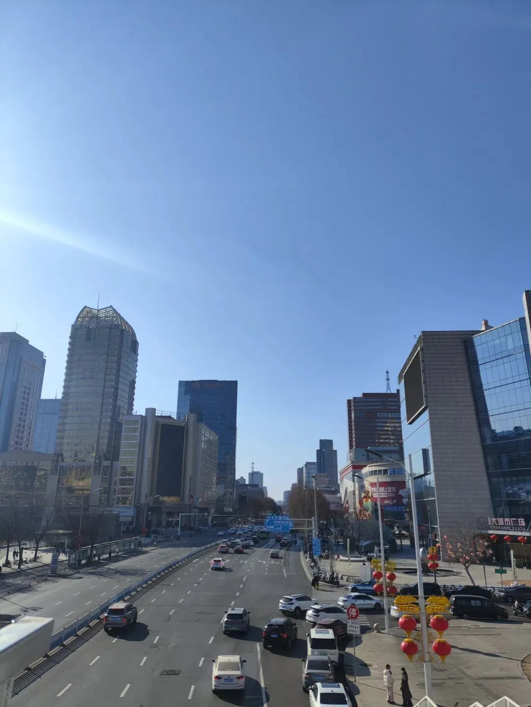 穿过天桥,远眺街景。