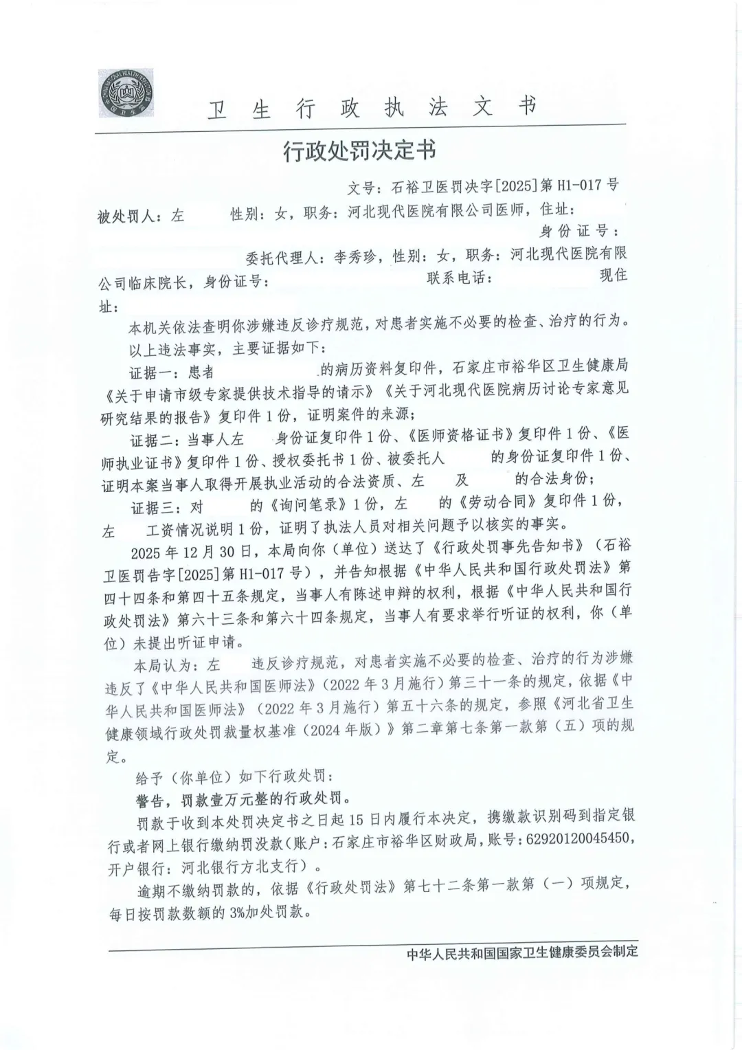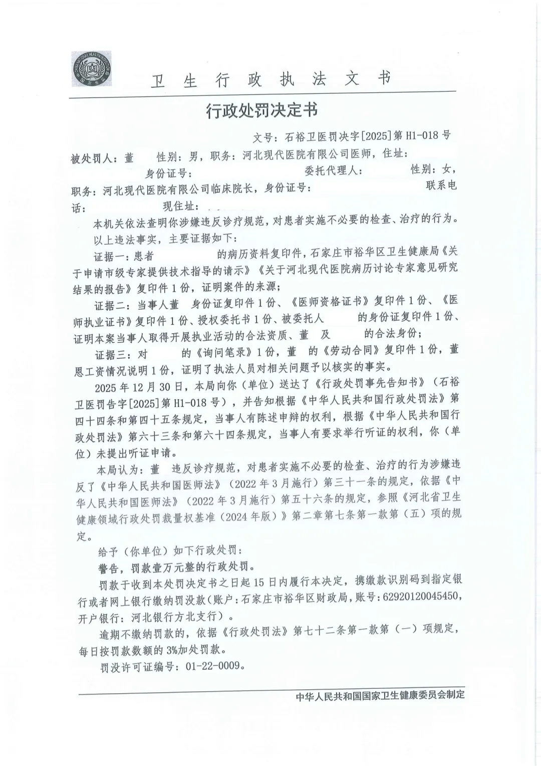 本机关依法查明你涉嫌违反诊疗规范,对患者实施不必要的检查、治疗的行为。给予(你单位)如下行政处罚:警告,罚款壹万元整的行政处罚。