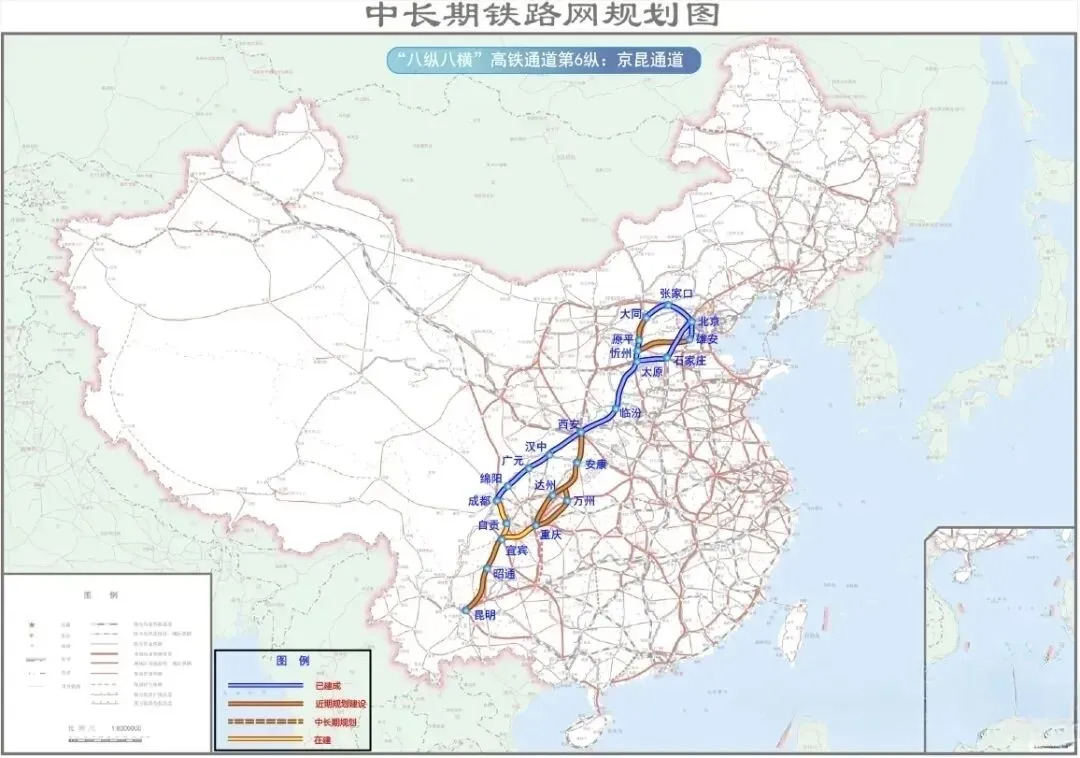 根据2016版《中长期铁路网规划》,京昆通道是国家“八纵八横”高速铁路主通道之中明确的一纵,其法定主通道走向为:北京—石家庄—太原—西安—成都/重庆—昆明,并同步规划北京—张家口—大同—太原作为北线并行分支。这条主通道直接串联京津冀、太原、关中平原、成渝、滇中五大国家级城市群,是国家综合立体交通网“6轴、7廊、8通道”主骨架的关键组成部分。而后续建设的雄忻高铁(雄安—忻州),在国家路网层级中,明确为京昆通道的辅助补充通道、区域加密联络线,并非主通道,更不具备替代既有主通道的法定资格与路网功能。