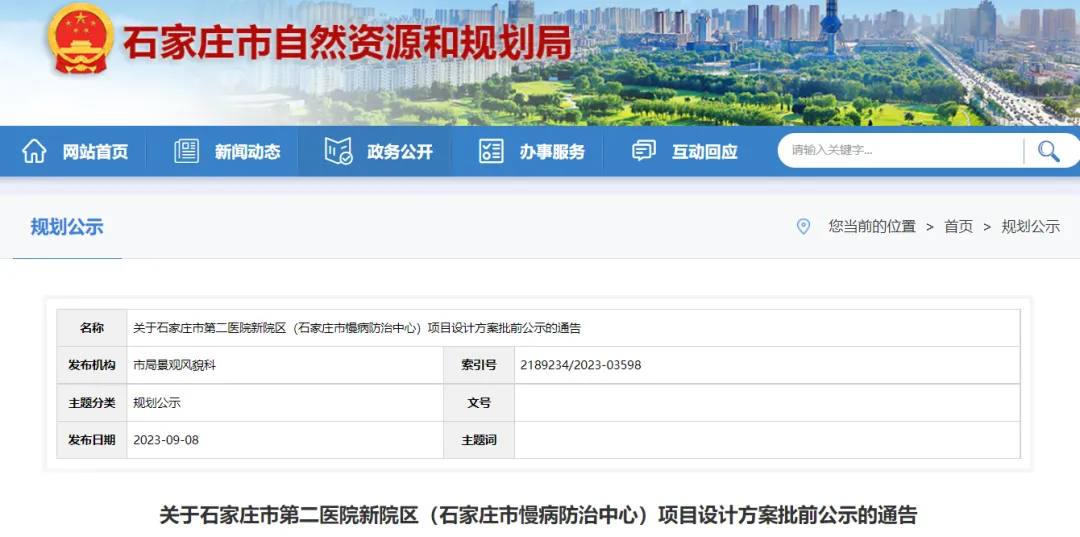 石家庄市第二医院关于石家庄市第二医院新院区 (石家庄市慢病防治中心) 的报建申请,正在审查设计方案。该项目位于北邻荣盛御府居民区,南至天苑路,西至景源街,用地性质为医疗卫生用地,用地面积约为60936平方米,属于正常办理,拟建设医院。