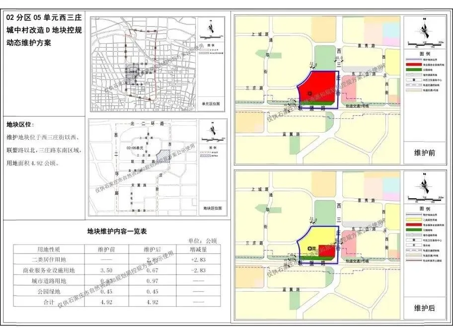 维护后,二类居住用地增加至2.83公顷(42.45亩),商业服务业设施用地减少至0.67公顷(10.05亩),城市道路用地(0.97公顷)和公园绿地用地(0.45公顷)不变。