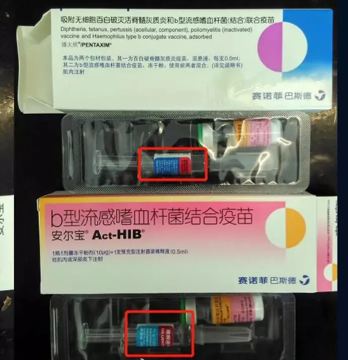 五联疫苗与hib疫苗近照显示,五联疫苗注射器上的字体是黑色三行字,hib疫苗注射器上的字体是两行白色字(稀释液,DILUENTS)。