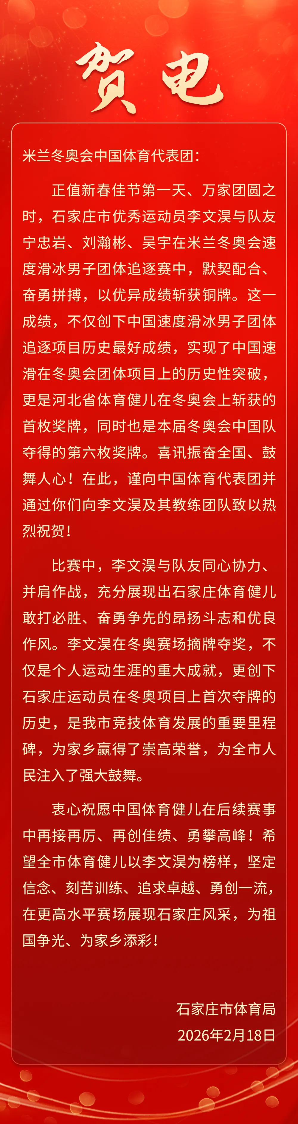 赛后,石家庄市体育局向米兰冬奥会中国体育代表团发送了贺电。