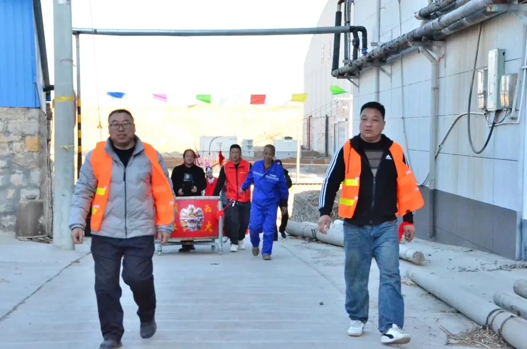 图片里穿红色马甲的是志愿者,他们拿着乐器,和其他人一起在社火表演中营造热闹氛围
