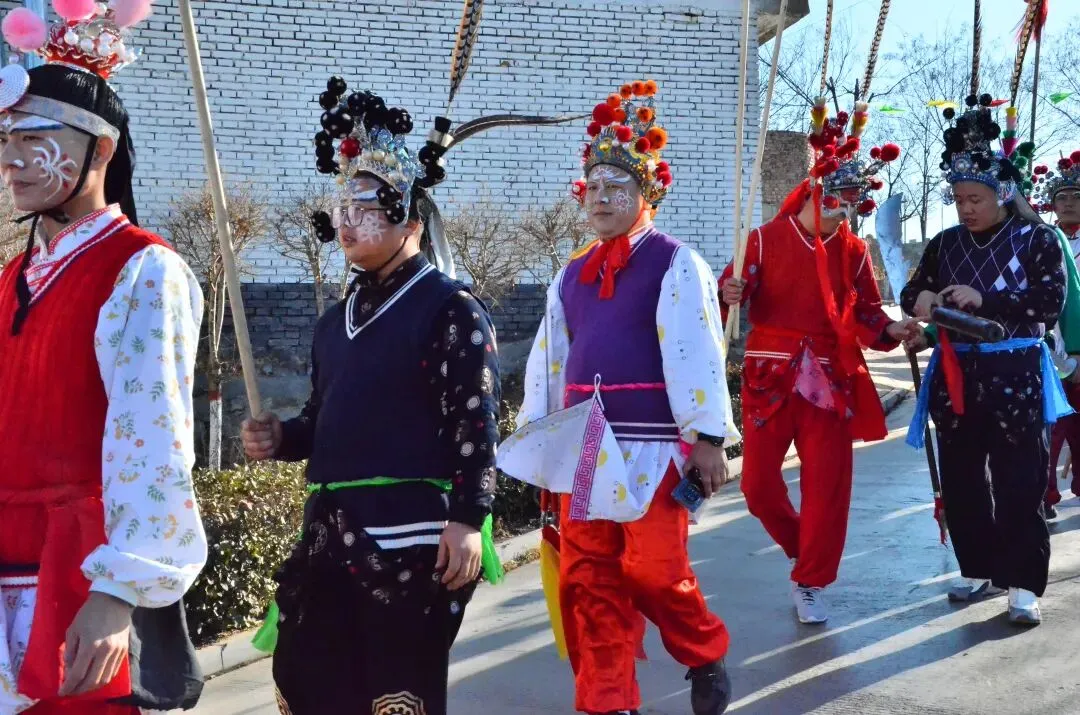 这支社火队伍真威风,红脸紫脸的角色,穿着华丽的戏服,手持长刀枪,春节看这个,年味一下就浓了