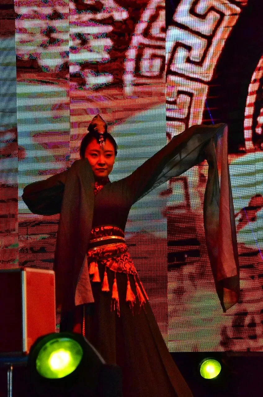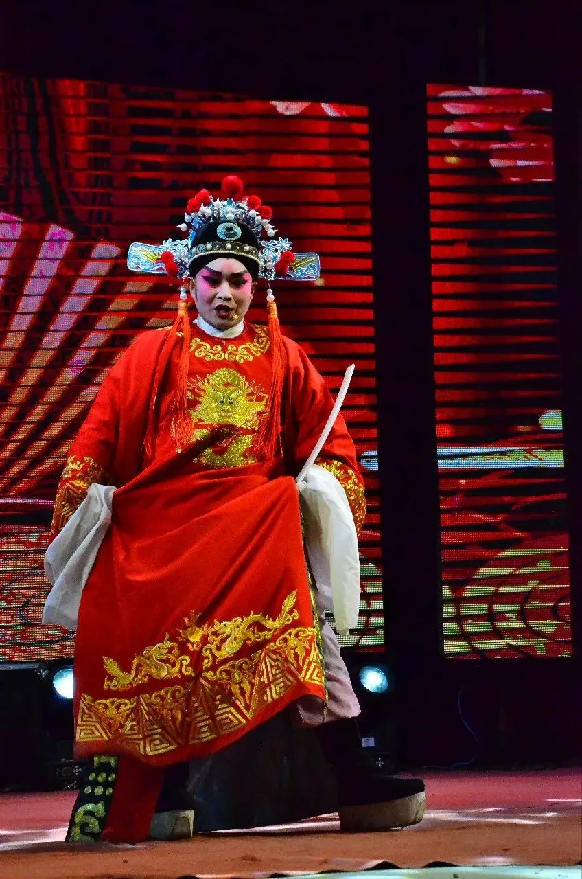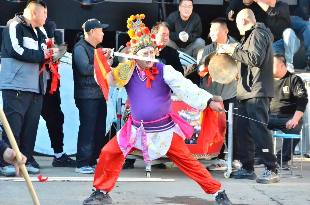 这位表演者好投入,穿着现代上衣却挥着传统道具刀,额头还点着红印