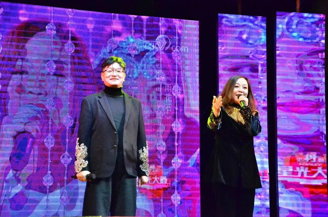 这是乡村春晚的主持人,两男两女搭配得很专业,红色礼服和深色西装,特别有节日氛围