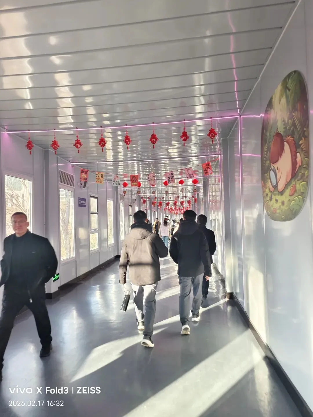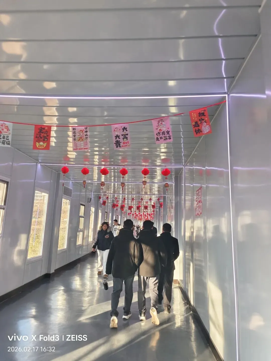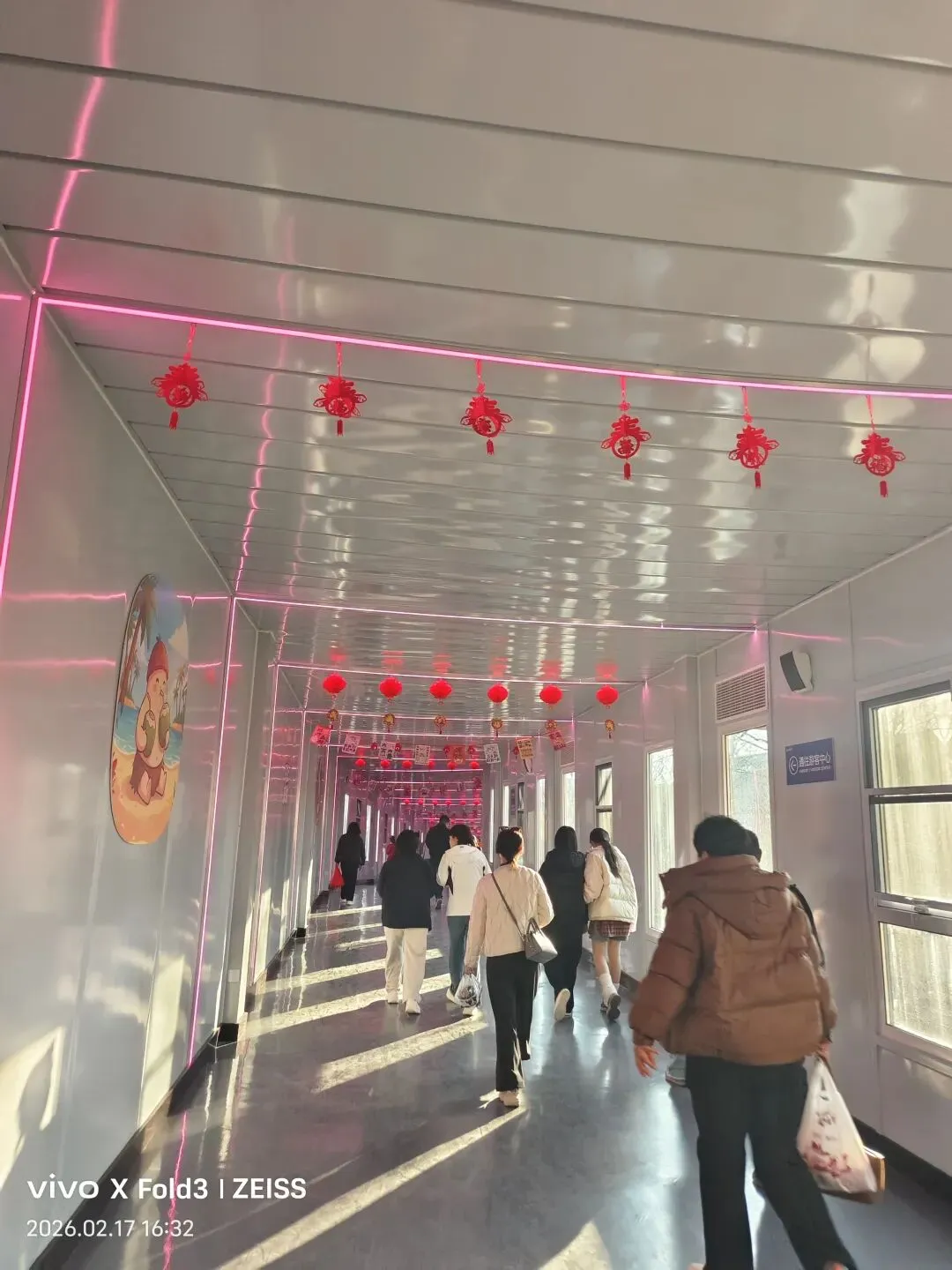 从大厅刷票进入,首先要经过一个长长的通道,节日期间,通道中挂满了红色的灯笼、中国结和写着美好寓意的彩联。墙壁上也粘贴着各色图案和字体。夜晚灯光亮起,又是一番景致。之所以喜欢春节出门游玩,是因为这时候的喜庆气氛是平时看不到的。