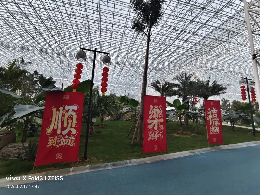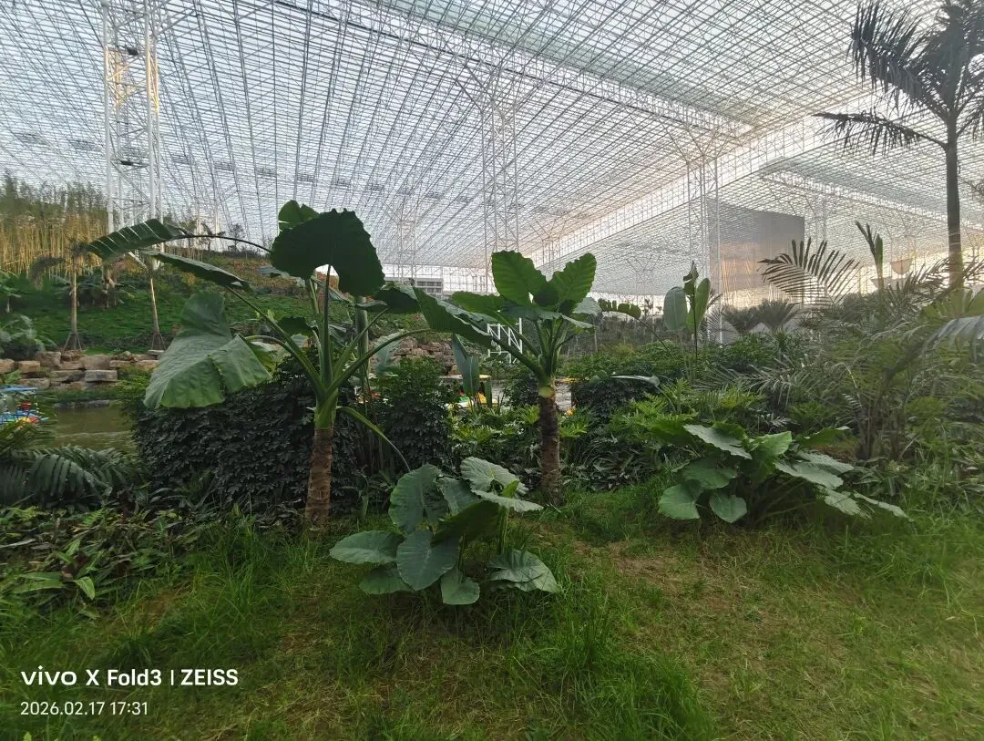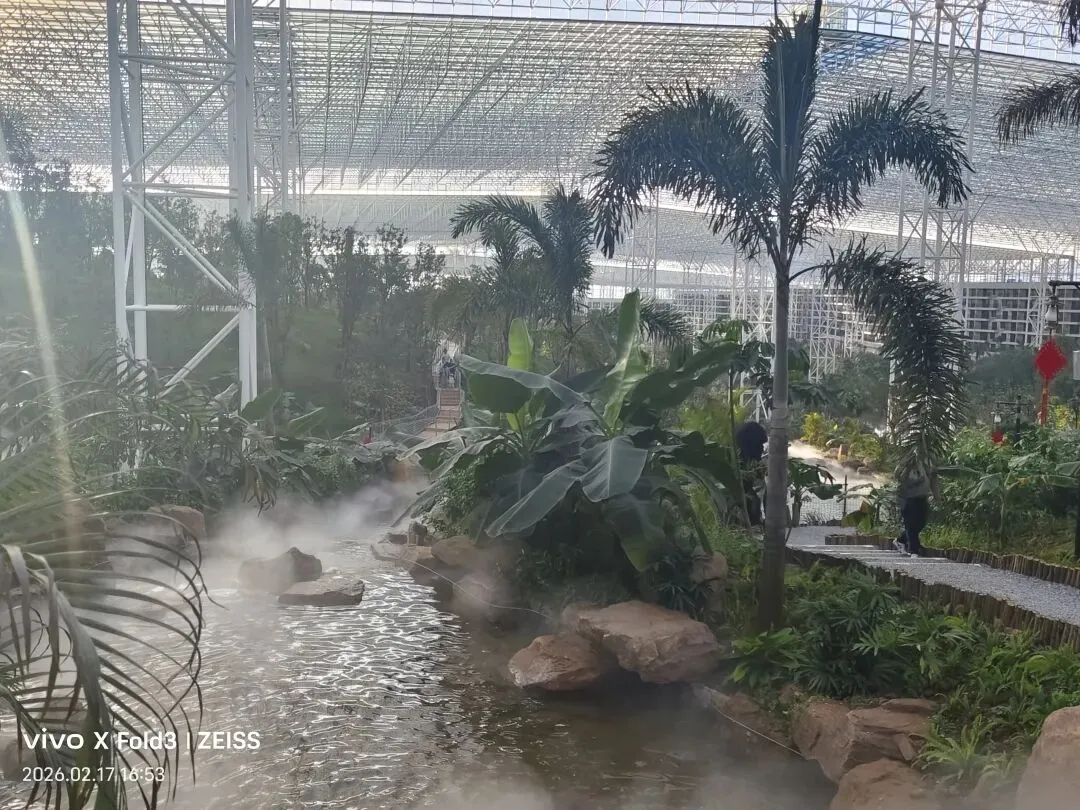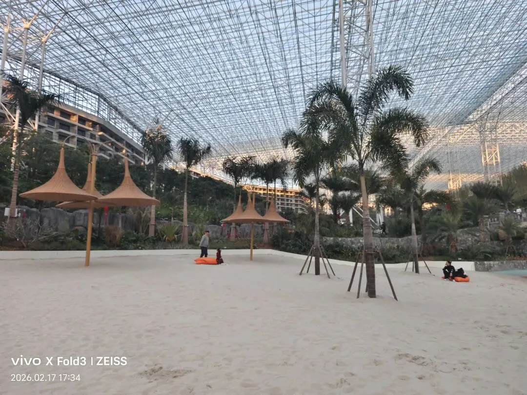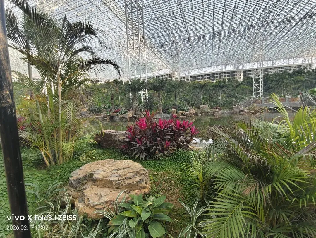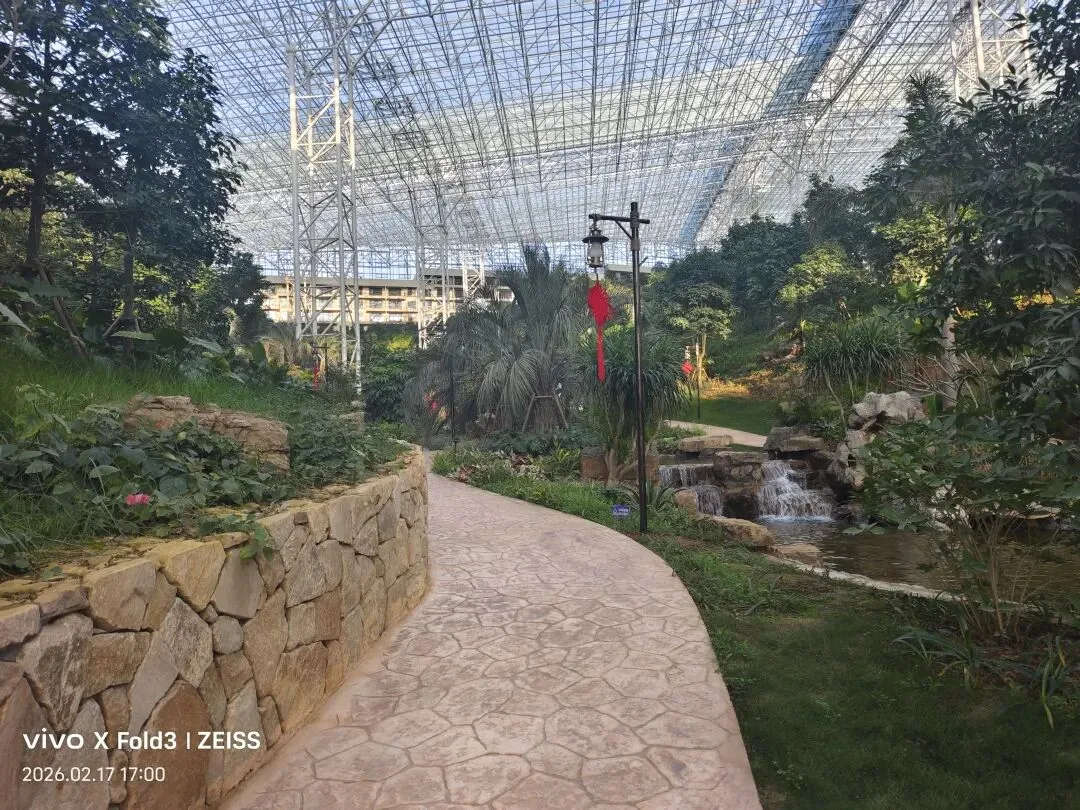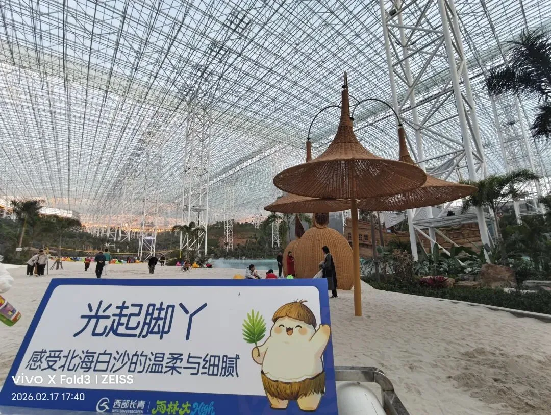 中间有小径通往不同的观赏区。先来到小鸟天堂和恐龙谷。小鸟天堂是一处小小的鸟类乐园。有一条浅浅的细流流过鹅卵石,散养的孔雀一点都不怕人,那只白孔雀优雅的走过来,靠近我,只是我怎么逗它,它都不展开美丽的羽翼。见惯了在地上走动的孔雀,没想到在树木高高的枝丫上还有两个孔雀在栖息。巨大的身形,墨绿色的长长的羽尾在垂落枝丫中间,树木都显得有点袖珍了。 恐龙谷里面有人工做成的恐龙和黑熊。其皮肤和毛发做的很真实,质感很好,加上光电效应,能行动,还能发出巨大的吼声,倒是真的有点吓人的。也引来许多人围观拍照。 景区内有水流由高到低流淌,形成溪流、瀑布和水湾。一路行走,一路水声不绝于耳。木栈道,卵石路和台阶路在园区内蜿蜒,一路行走,听水声,看瀑布,观溪流,是一种非常惬意的感觉。水雾从水面升起,阳光透过玻璃顶棚,照射在水面上,散发着粼粼波光。眼前的一切就形成一副美丽的画面。 雨林里面最吸引目光的还是亚热带植物。这里的亚热带植物特征明显,芭蕉树、滴水观音,植株壮硕,叶子更是宽大厚实。散尾葵,针叶葵,布迪椰子树亭亭玉立,顶端的叶子纤细修长。狐尾椰和大王椰树干高大笔挺,直冲天际。碧绿的铜钱草铺满地面,金边吊兰,棕榈树和红铁树在期间装点。整个园区树木花草种类繁多,从地表到高空,从铜钱草到椰子树,高高低低,错落有致的在整个空间蓬蓬勃勃的生长着。下午的阳光透过玻璃顶棚照射下来,为绿植镀上一抹亮光,让草地、植株、树木都熠熠生辉。 景区西部是一片人工水域和沙滩。白色沙子细腻柔软,踩踏上去非常舒适。池底满铺浅蓝色的防渗膜,所以水面呈浅蓝色,与白色的沙滩,沙滩上五颜六色的躺椅,椰子树和遮阳棚,构成一副海滨模样。也许在夏日里,在沙滩上的躺椅上躺上一躺,也是一种不错的感觉呢。水域对面是还有一座大型的海盗船,白色风帆,木制船身,造型古朴,融入此处环境中,出片还是很好的。 沿着蓝色跑道继续向前,有一片缓坡草坪,是一个拍摄婚纱照的好地方。返回回到大门口,这里日气氛浓郁,门口对面是一道红色大门,大门一侧有“福”“禧”“乐”“顺”四个大字,大字下面是:福到吾家,禧到眉梢,乐到开怀,顺到如意。另一侧的红色标牌写着:喜乐,顺遂,旺,如意。美好的祝福,是大家对美好生活的共同期盼。 新的一年来到了,愿我们所求皆如愿,所行皆坦途,多喜乐,长安康!