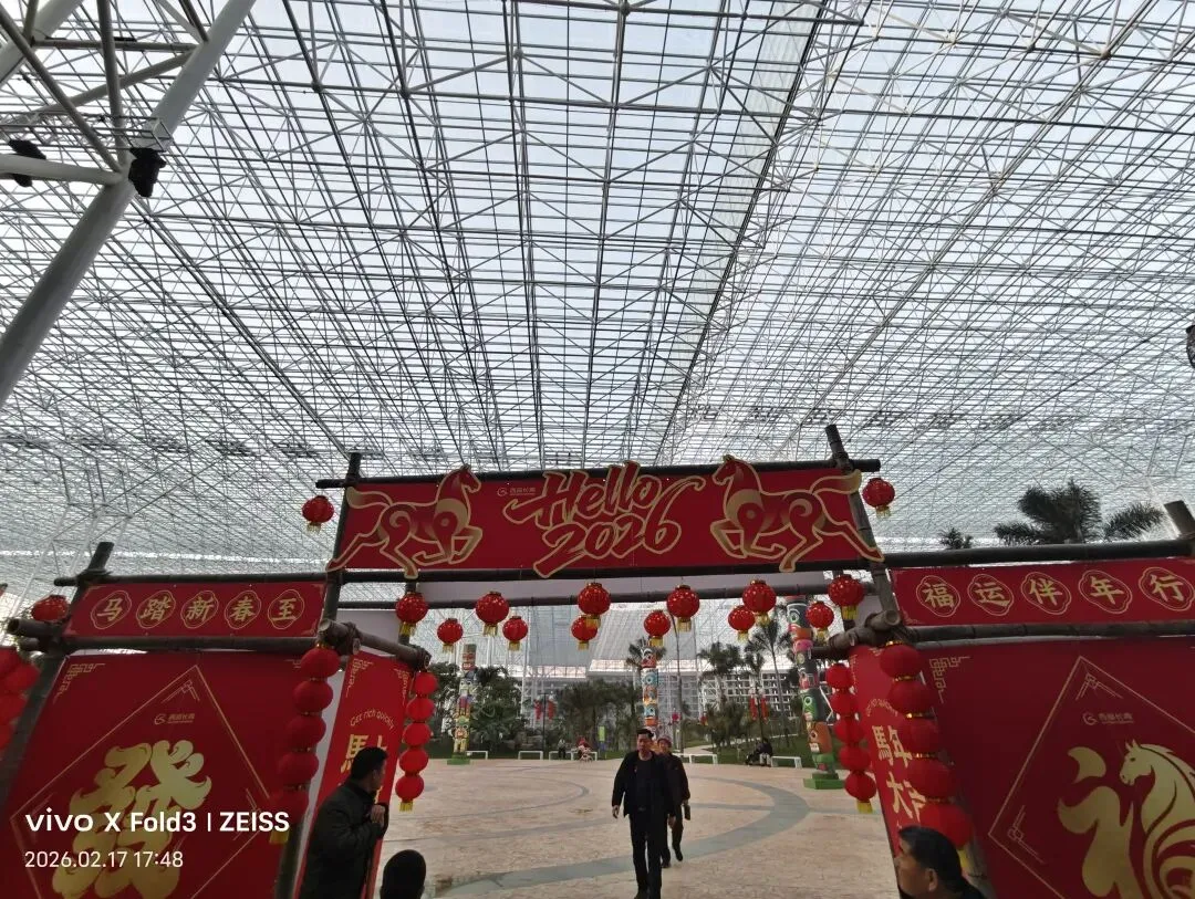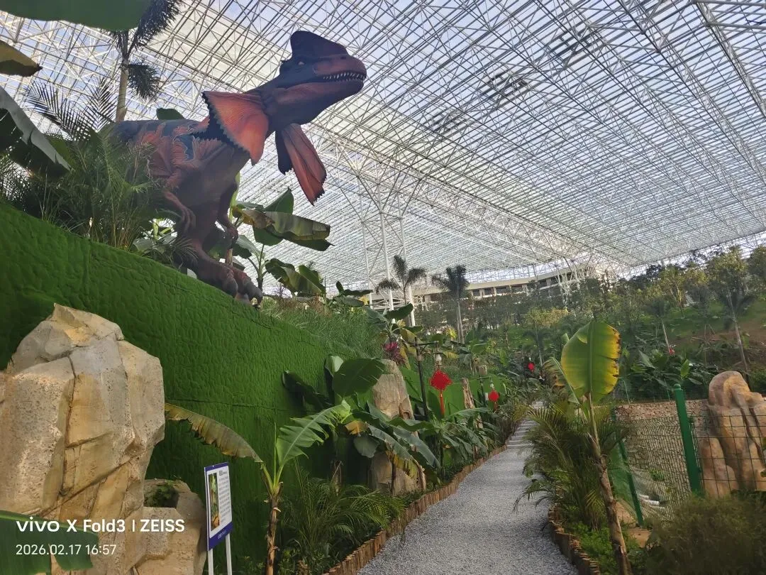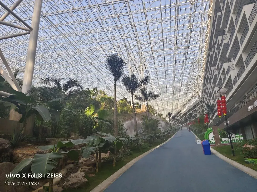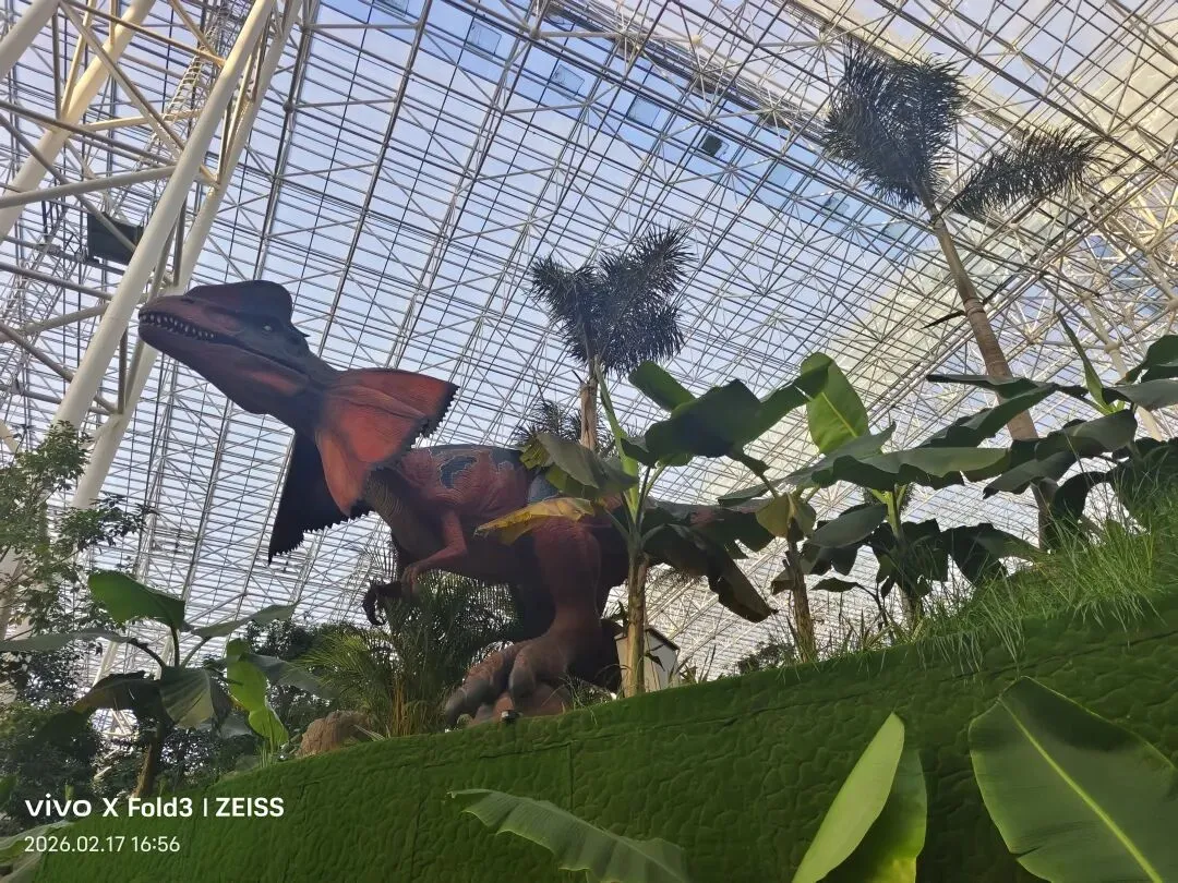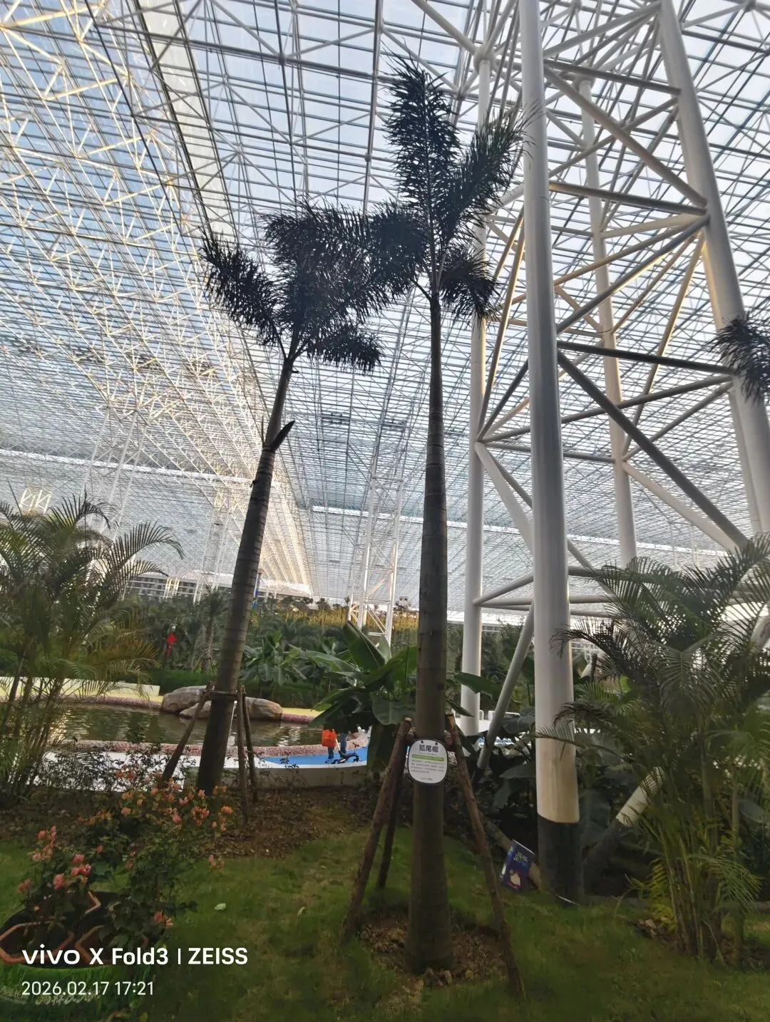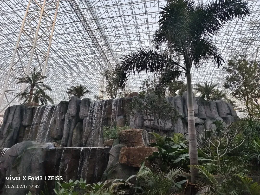 中间有小径通往不同的观赏区。先来到小鸟天堂和恐龙谷。小鸟天堂是一处小小的鸟类乐园。有一条浅浅的细流流过鹅卵石,散养的孔雀一点都不怕人,那只白孔雀优雅的走过来,靠近我,只是我怎么逗它,它都不展开美丽的羽翼。见惯了在地上走动的孔雀,没想到在树木高高的枝丫上还有两个孔雀在栖息。巨大的身形,墨绿色的长长的羽尾在垂落枝丫中间,树木都显得有点袖珍了。 恐龙谷里面有人工做成的恐龙和黑熊。其皮肤和毛发做的很真实,质感很好,加上光电效应,能行动,还能发出巨大的吼声,倒是真的有点吓人的。也引来许多人围观拍照。 景区内有水流由高到低流淌,形成溪流、瀑布和水湾。一路行走,一路水声不绝于耳。木栈道,卵石路和台阶路在园区内蜿蜒,一路行走,听水声,看瀑布,观溪流,是一种非常惬意的感觉。水雾从水面升起,阳光透过玻璃顶棚,照射在水面上,散发着粼粼波光。眼前的一切就形成一副美丽的画面。 雨林里面最吸引目光的还是亚热带植物。这里的亚热带植物特征明显,芭蕉树、滴水观音,植株壮硕,叶子更是宽大厚实。散尾葵,针叶葵,布迪椰子树亭亭玉立,顶端的叶子纤细修长。狐尾椰和大王椰树干高大笔挺,直冲天际。碧绿的铜钱草铺满地面,金边吊兰,棕榈树和红铁树在期间装点。整个园区树木花草种类繁多,从地表到高空,从铜钱草到椰子树,高高低低,错落有致的在整个空间蓬蓬勃勃的生长着。下午的阳光透过玻璃顶棚照射下来,为绿植镀上一抹亮光,让草地、植株、树木都熠熠生辉。 景区西部是一片人工水域和沙滩。白色沙子细腻柔软,踩踏上去非常舒适。池底满铺浅蓝色的防渗膜,所以水面呈浅蓝色,与白色的沙滩,沙滩上五颜六色的躺椅,椰子树和遮阳棚,构成一副海滨模样。也许在夏日里,在沙滩上的躺椅上躺上一躺,也是一种不错的感觉呢。水域对面是还有一座大型的海盗船,白色风帆,木制船身,造型古朴,融入此处环境中,出片还是很好的。 沿着蓝色跑道继续向前,有一片缓坡草坪,是一个拍摄婚纱照的好地方。返回回到大门口,这里日气氛浓郁,门口对面是一道红色大门,大门一侧有“福”“禧”“乐”“顺”四个大字,大字下面是:福到吾家,禧到眉梢,乐到开怀,顺到如意。另一侧的红色标牌写着:喜乐,顺遂,旺,如意。美好的祝福,是大家对美好生活的共同期盼。 新的一年来到了,愿我们所求皆如愿,所行皆坦途,多喜乐,长安康!