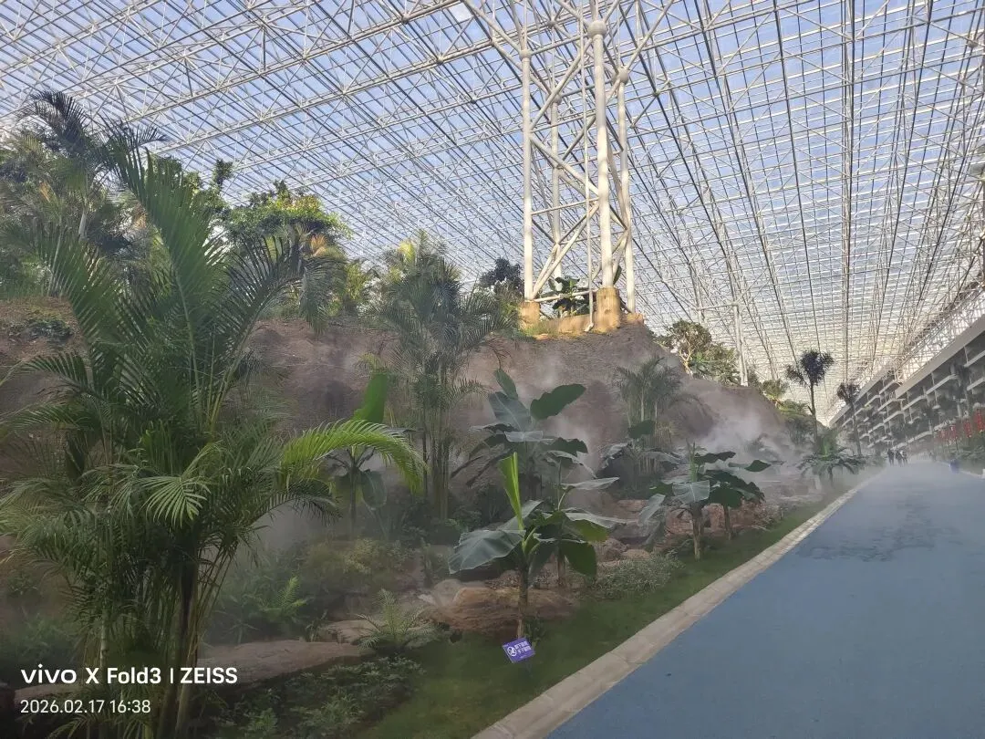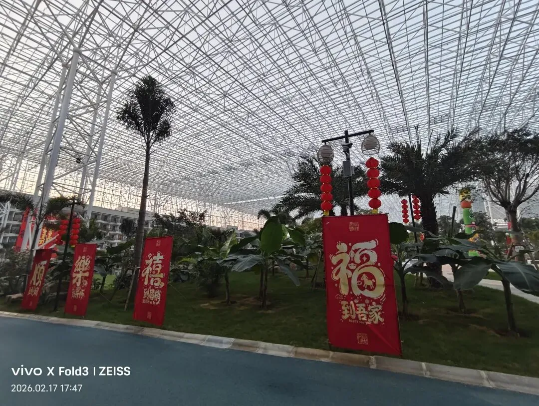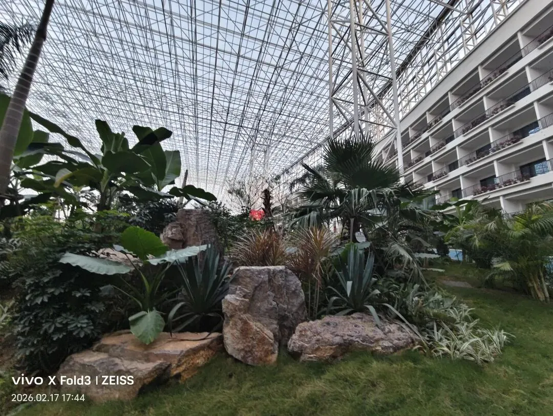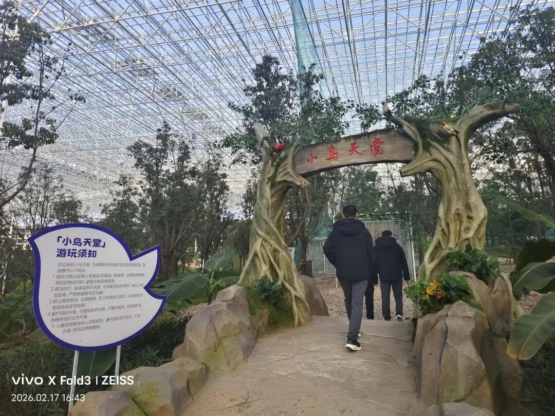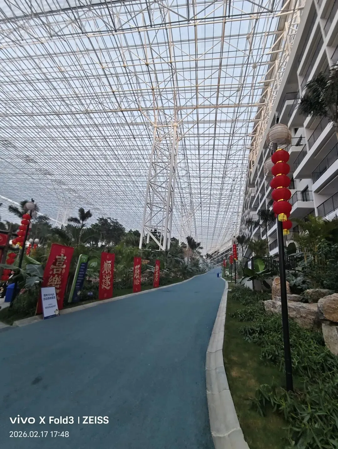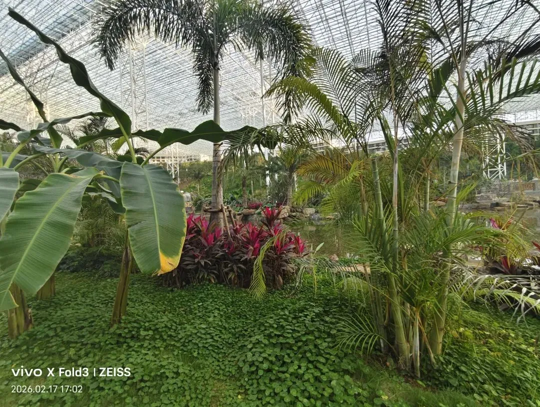 中间有小径通往不同的观赏区。先来到小鸟天堂和恐龙谷。小鸟天堂是一处小小的鸟类乐园。有一条浅浅的细流流过鹅卵石,散养的孔雀一点都不怕人,那只白孔雀优雅的走过来,靠近我,只是我怎么逗它,它都不展开美丽的羽翼。见惯了在地上走动的孔雀,没想到在树木高高的枝丫上还有两个孔雀在栖息。巨大的身形,墨绿色的长长的羽尾在垂落枝丫中间,树木都显得有点袖珍了。 恐龙谷里面有人工做成的恐龙和黑熊。其皮肤和毛发做的很真实,质感很好,加上光电效应,能行动,还能发出巨大的吼声,倒是真的有点吓人的。也引来许多人围观拍照。 景区内有水流由高到低流淌,形成溪流、瀑布和水湾。一路行走,一路水声不绝于耳。木栈道,卵石路和台阶路在园区内蜿蜒,一路行走,听水声,看瀑布,观溪流,是一种非常惬意的感觉。水雾从水面升起,阳光透过玻璃顶棚,照射在水面上,散发着粼粼波光。眼前的一切就形成一副美丽的画面。 雨林里面最吸引目光的还是亚热带植物。这里的亚热带植物特征明显,芭蕉树、滴水观音,植株壮硕,叶子更是宽大厚实。散尾葵,针叶葵,布迪椰子树亭亭玉立,顶端的叶子纤细修长。狐尾椰和大王椰树干高大笔挺,直冲天际。碧绿的铜钱草铺满地面,金边吊兰,棕榈树和红铁树在期间装点。整个园区树木花草种类繁多,从地表到高空,从铜钱草到椰子树,高高低低,错落有致的在整个空间蓬蓬勃勃的生长着。下午的阳光透过玻璃顶棚照射下来,为绿植镀上一抹亮光,让草地、植株、树木都熠熠生辉。 景区西部是一片人工水域和沙滩。白色沙子细腻柔软,踩踏上去非常舒适。池底满铺浅蓝色的防渗膜,所以水面呈浅蓝色,与白色的沙滩,沙滩上五颜六色的躺椅,椰子树和遮阳棚,构成一副海滨模样。也许在夏日里,在沙滩上的躺椅上躺上一躺,也是一种不错的感觉呢。水域对面是还有一座大型的海盗船,白色风帆,木制船身,造型古朴,融入此处环境中,出片还是很好的。 沿着蓝色跑道继续向前,有一片缓坡草坪,是一个拍摄婚纱照的好地方。返回回到大门口,这里日气氛浓郁,门口对面是一道红色大门,大门一侧有“福”“禧”“乐”“顺”四个大字,大字下面是:福到吾家,禧到眉梢,乐到开怀,顺到如意。另一侧的红色标牌写着:喜乐,顺遂,旺,如意。美好的祝福,是大家对美好生活的共同期盼。 新的一年来到了,愿我们所求皆如愿,所行皆坦途,多喜乐,长安康!