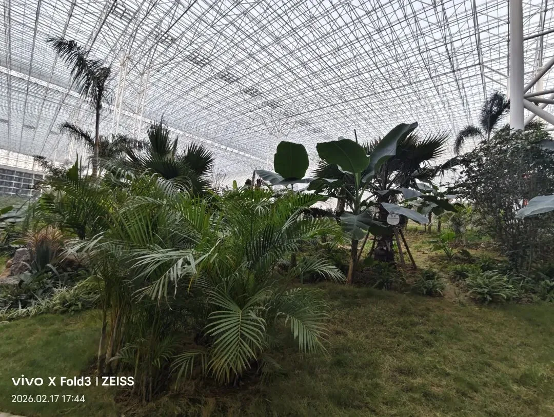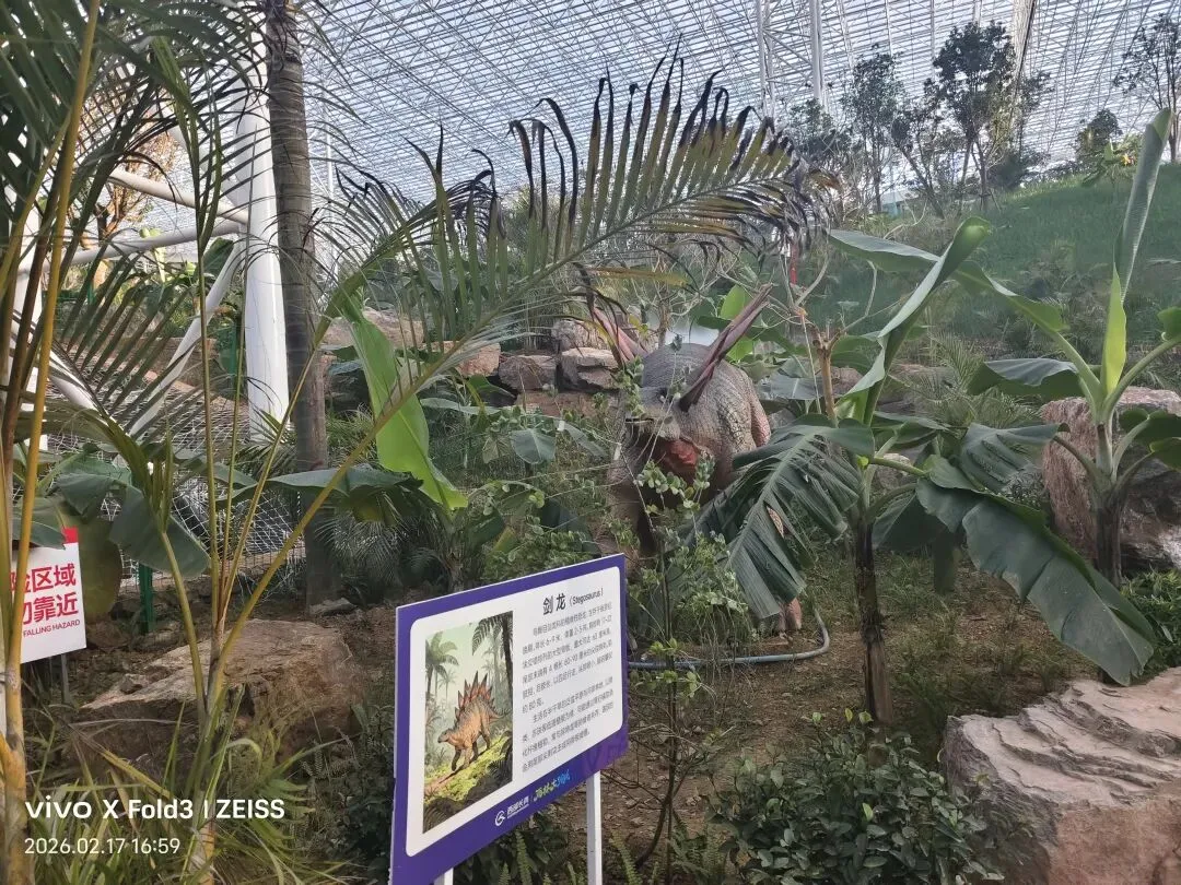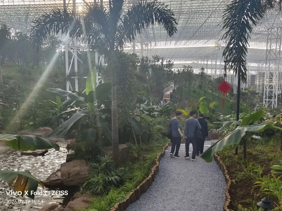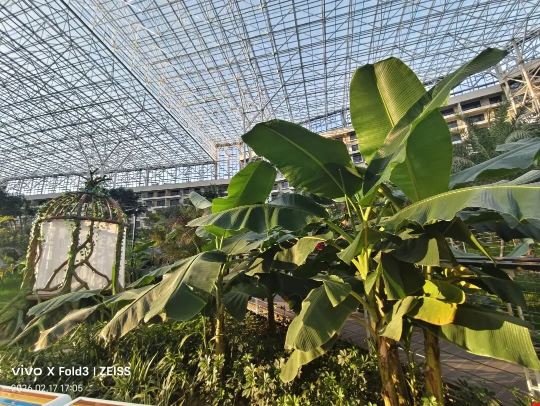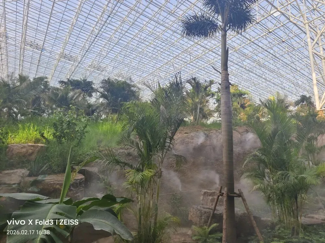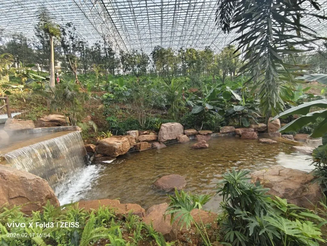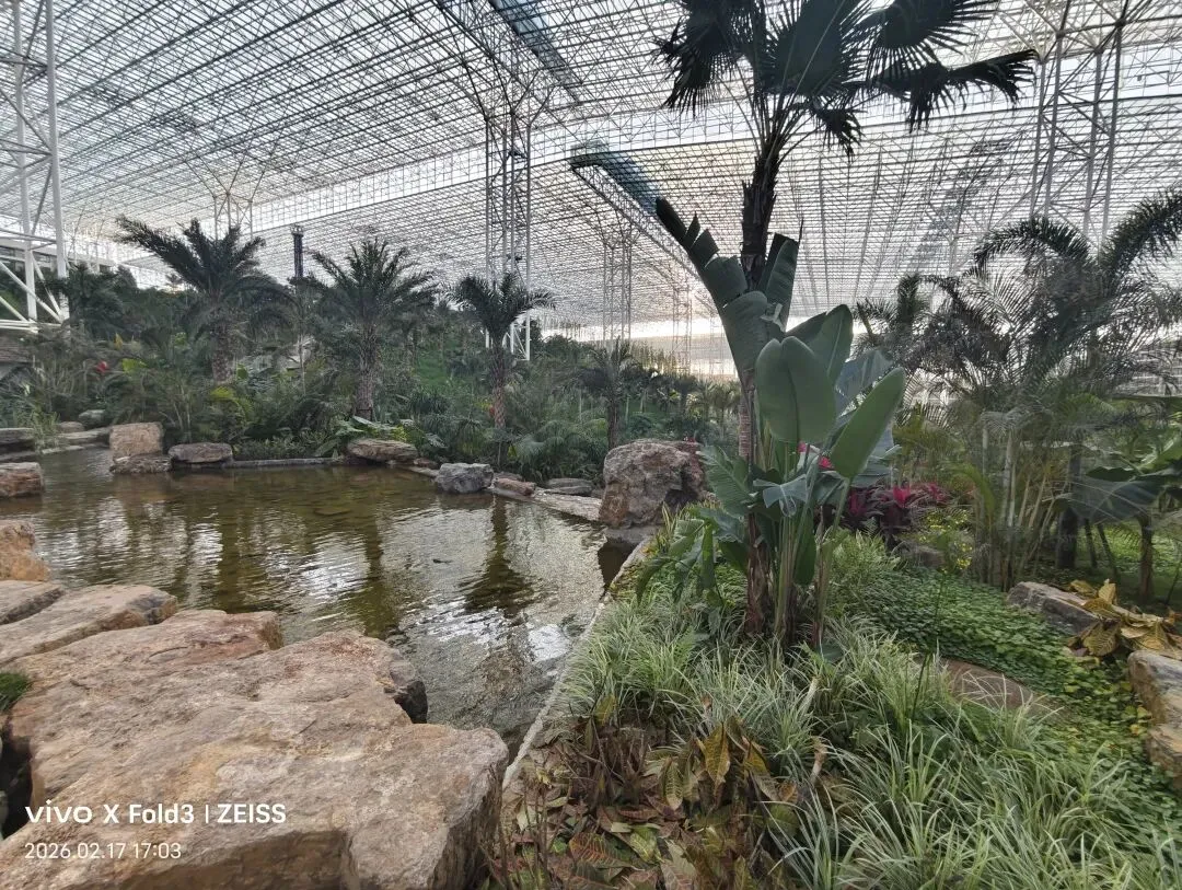 中间有小径通往不同的观赏区。先来到小鸟天堂和恐龙谷。小鸟天堂是一处小小的鸟类乐园。有一条浅浅的细流流过鹅卵石,散养的孔雀一点都不怕人,那只白孔雀优雅的走过来,靠近我,只是我怎么逗它,它都不展开美丽的羽翼。见惯了在地上走动的孔雀,没想到在树木高高的枝丫上还有两个孔雀在栖息。巨大的身形,墨绿色的长长的羽尾在垂落枝丫中间,树木都显得有点袖珍了。 恐龙谷里面有人工做成的恐龙和黑熊。其皮肤和毛发做的很真实,质感很好,加上光电效应,能行动,还能发出巨大的吼声,倒是真的有点吓人的。也引来许多人围观拍照。 景区内有水流由高到低流淌,形成溪流、瀑布和水湾。一路行走,一路水声不绝于耳。木栈道,卵石路和台阶路在园区内蜿蜒,一路行走,听水声,看瀑布,观溪流,是一种非常惬意的感觉。水雾从水面升起,阳光透过玻璃顶棚,照射在水面上,散发着粼粼波光。眼前的一切就形成一副美丽的画面。 雨林里面最吸引目光的还是亚热带植物。这里的亚热带植物特征明显,芭蕉树、滴水观音,植株壮硕,叶子更是宽大厚实。散尾葵,针叶葵,布迪椰子树亭亭玉立,顶端的叶子纤细修长。狐尾椰和大王椰树干高大笔挺,直冲天际。碧绿的铜钱草铺满地面,金边吊兰,棕榈树和红铁树在期间装点。整个园区树木花草种类繁多,从地表到高空,从铜钱草到椰子树,高高低低,错落有致的在整个空间蓬蓬勃勃的生长着。下午的阳光透过玻璃顶棚照射下来,为绿植镀上一抹亮光,让草地、植株、树木都熠熠生辉。 景区西部是一片人工水域和沙滩。白色沙子细腻柔软,踩踏上去非常舒适。池底满铺浅蓝色的防渗膜,所以水面呈浅蓝色,与白色的沙滩,沙滩上五颜六色的躺椅,椰子树和遮阳棚,构成一副海滨模样。也许在夏日里,在沙滩上的躺椅上躺上一躺,也是一种不错的感觉呢。水域对面是还有一座大型的海盗船,白色风帆,木制船身,造型古朴,融入此处环境中,出片还是很好的。 沿着蓝色跑道继续向前,有一片缓坡草坪,是一个拍摄婚纱照的好地方。返回回到大门口,这里日气氛浓郁,门口对面是一道红色大门,大门一侧有“福”“禧”“乐”“顺”四个大字,大字下面是:福到吾家,禧到眉梢,乐到开怀,顺到如意。另一侧的红色标牌写着:喜乐,顺遂,旺,如意。美好的祝福,是大家对美好生活的共同期盼。 新的一年来到了,愿我们所求皆如愿,所行皆坦途,多喜乐,长安康!