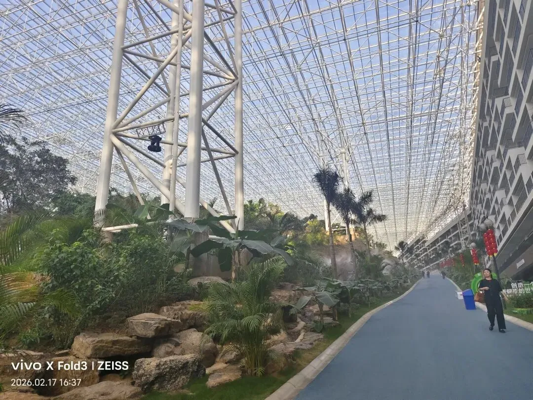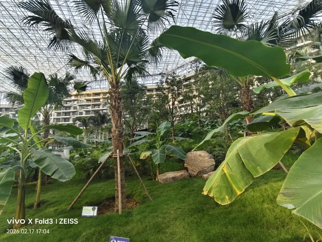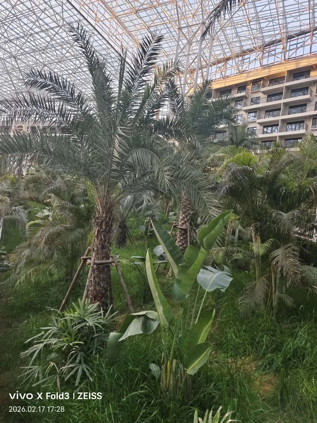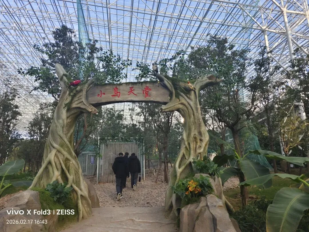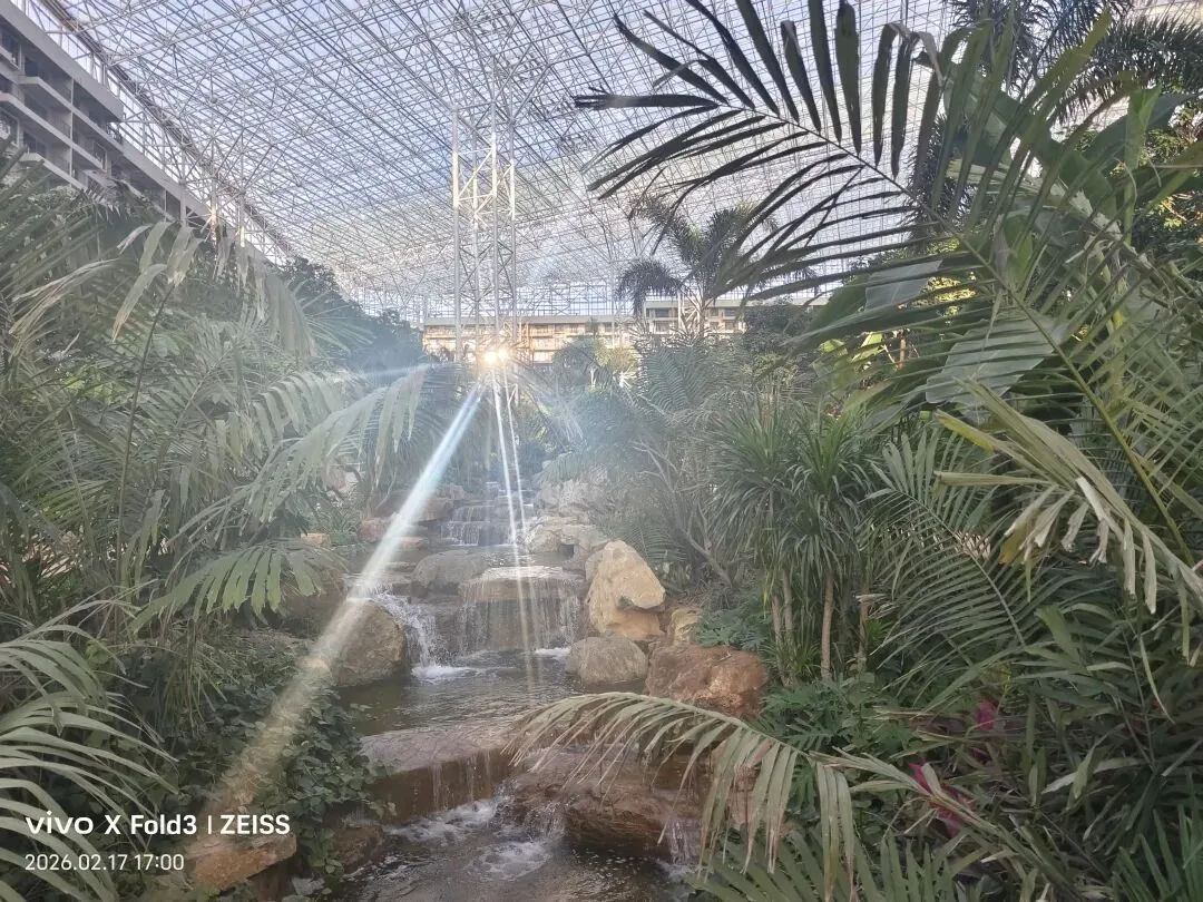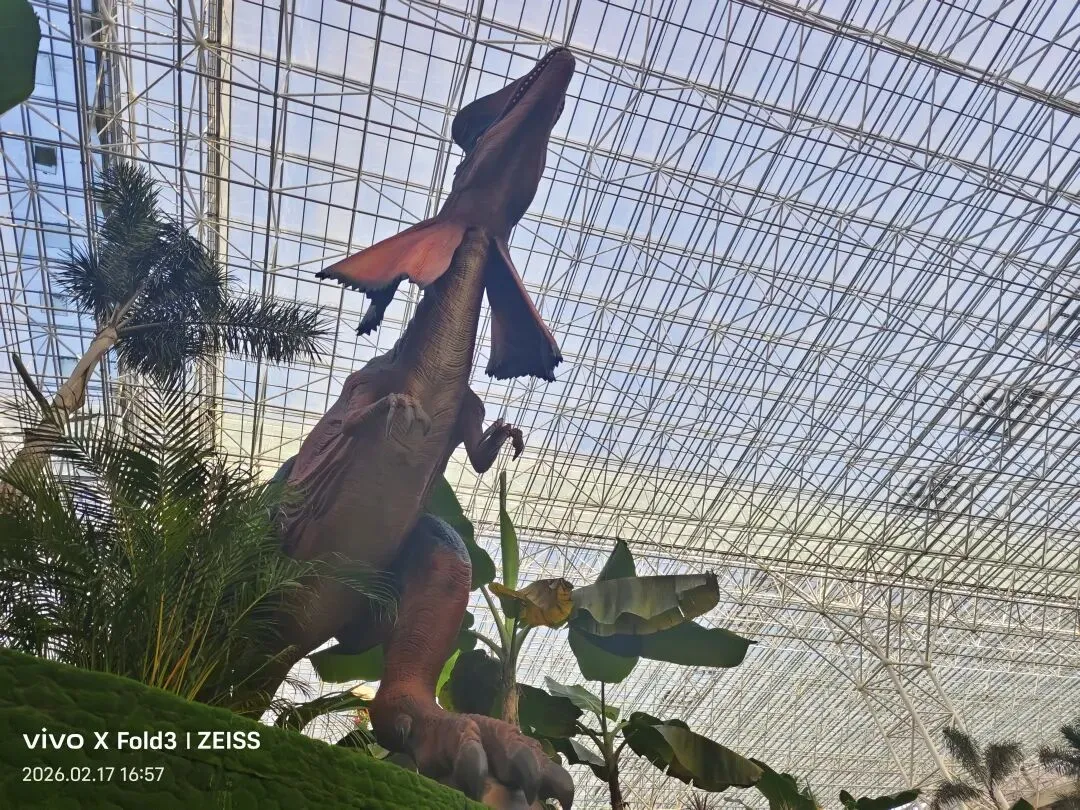中间有小径通往不同的观赏区。先来到小鸟天堂和恐龙谷。小鸟天堂是一处小小的鸟类乐园。有一条浅浅的细流流过鹅卵石,散养的孔雀一点都不怕人,那只白孔雀优雅的走过来,靠近我,只是我怎么逗它,它都不展开美丽的羽翼。见惯了在地上走动的孔雀,没想到在树木高高的枝丫上还有两个孔雀在栖息。巨大的身形,墨绿色的长长的羽尾在垂落枝丫中间,树木都显得有点袖珍了。 恐龙谷里面有人工做成的恐龙和黑熊。其皮肤和毛发做的很真实,质感很好,加上光电效应,能行动,还能发出巨大的吼声,倒是真的有点吓人的。也引来许多人围观拍照。 景区内有水流由高到低流淌,形成溪流、瀑布和水湾。一路行走,一路水声不绝于耳。木栈道,卵石路和台阶路在园区内蜿蜒,一路行走,听水声,看瀑布,观溪流,是一种非常惬意的感觉。水雾从水面升起,阳光透过玻璃顶棚,照射在水面上,散发着粼粼波光。眼前的一切就形成一副美丽的画面。 雨林里面最吸引目光的还是亚热带植物。这里的亚热带植物特征明显,芭蕉树、滴水观音,植株壮硕,叶子更是宽大厚实。散尾葵,针叶葵,布迪椰子树亭亭玉立,顶端的叶子纤细修长。狐尾椰和大王椰树干高大笔挺,直冲天际。碧绿的铜钱草铺满地面,金边吊兰,棕榈树和红铁树在期间装点。整个园区树木花草种类繁多,从地表到高空,从铜钱草到椰子树,高高低低,错落有致的在整个空间蓬蓬勃勃的生长着。下午的阳光透过玻璃顶棚照射下来,为绿植镀上一抹亮光,让草地、植株、树木都熠熠生辉。 景区西部是一片人工水域和沙滩。白色沙子细腻柔软,踩踏上去非常舒适。池底满铺浅蓝色的防渗膜,所以水面呈浅蓝色,与白色的沙滩,沙滩上五颜六色的躺椅,椰子树和遮阳棚,构成一副海滨模样。也许在夏日里,在沙滩上的躺椅上躺上一躺,也是一种不错的感觉呢。水域对面是还有一座大型的海盗船,白色风帆,木制船身,造型古朴,融入此处环境中,出片还是很好的。 沿着蓝色跑道继续向前,有一片缓坡草坪,是一个拍摄婚纱照的好地方。返回回到大门口,这里日气氛浓郁,门口对面是一道红色大门,大门一侧有“福”“禧”“乐”“顺”四个大字,大字下面是:福到吾家,禧到眉梢,乐到开怀,顺到如意。另一侧的红色标牌写着:喜乐,顺遂,旺,如意。美好的祝福,是大家对美好生活的共同期盼。 新的一年来到了,愿我们所求皆如愿,所行皆坦途,多喜乐,长安康!