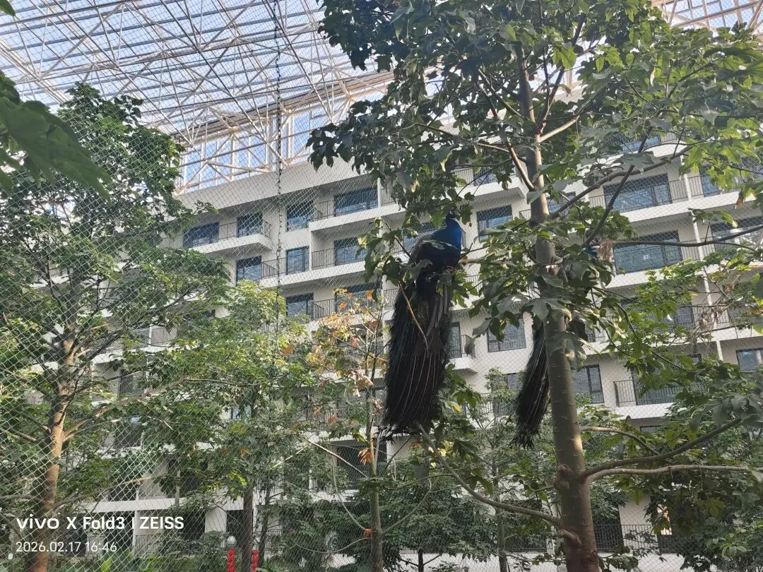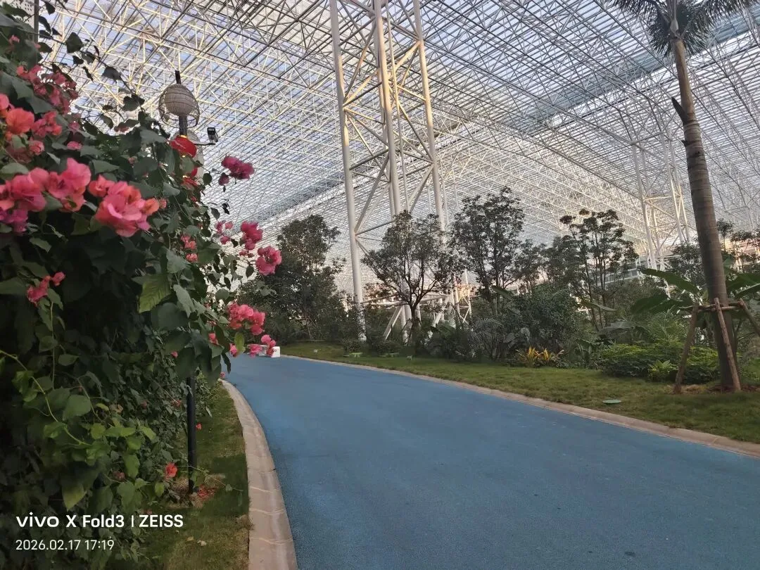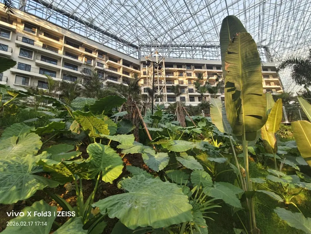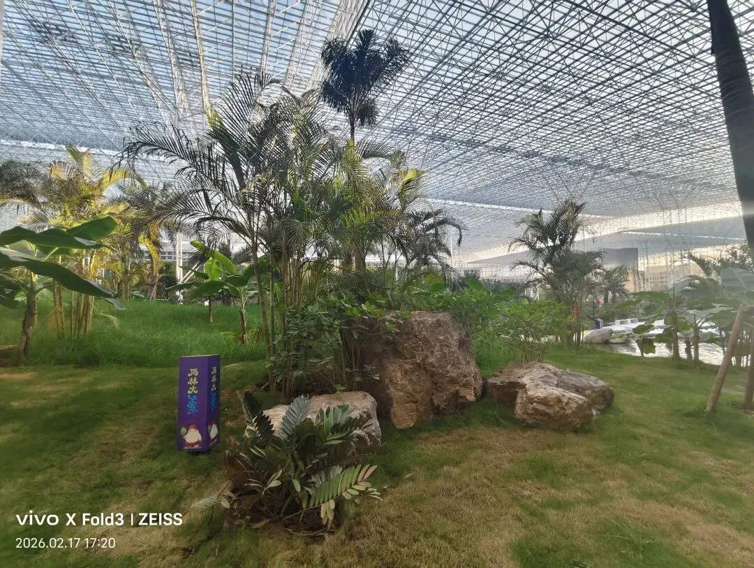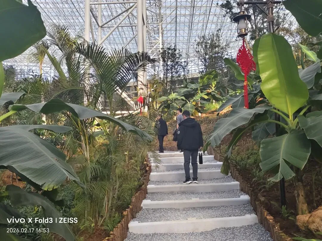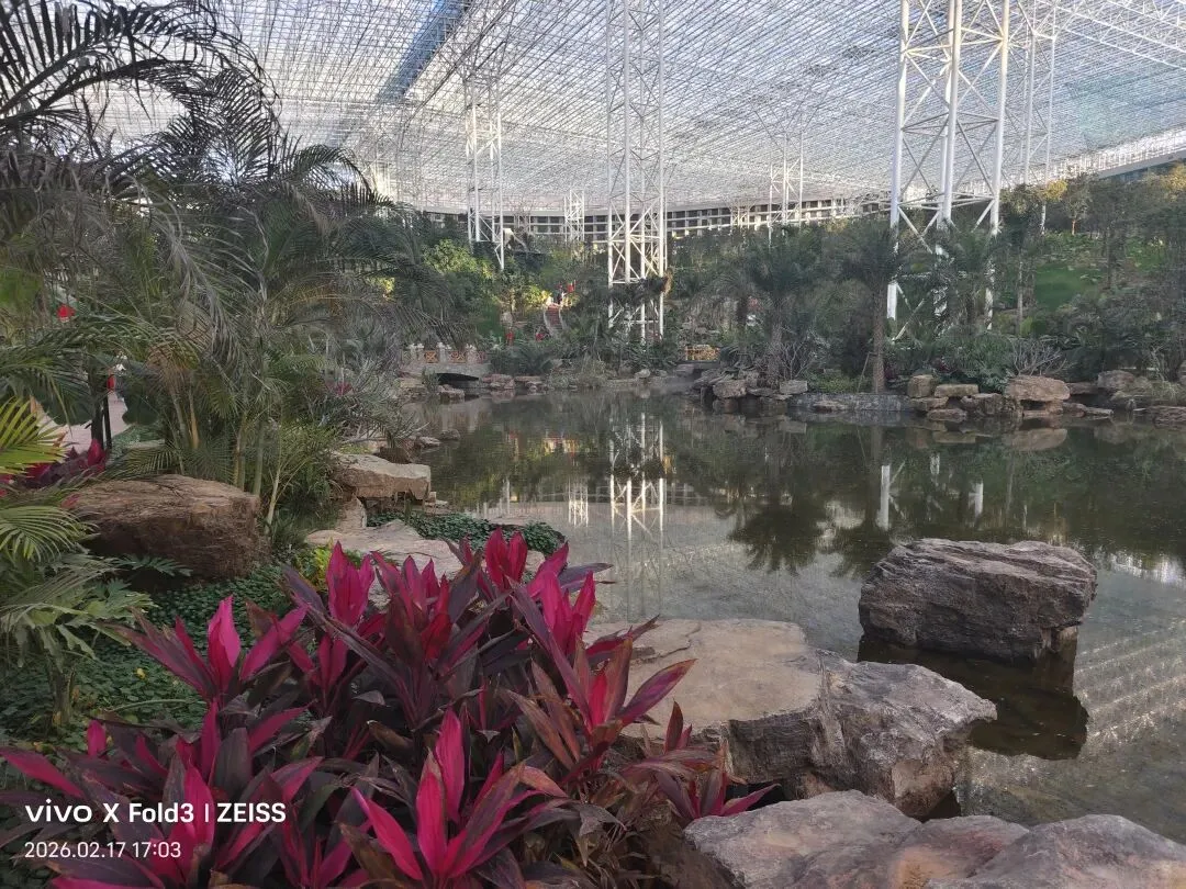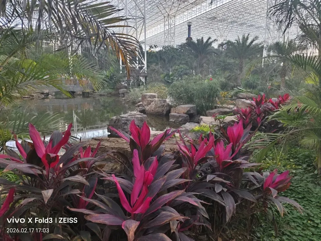 中间有小径通往不同的观赏区。先来到小鸟天堂和恐龙谷。小鸟天堂是一处小小的鸟类乐园。有一条浅浅的细流流过鹅卵石,散养的孔雀一点都不怕人,那只白孔雀优雅的走过来,靠近我,只是我怎么逗它,它都不展开美丽的羽翼。见惯了在地上走动的孔雀,没想到在树木高高的枝丫上还有两个孔雀在栖息。巨大的身形,墨绿色的长长的羽尾在垂落枝丫中间,树木都显得有点袖珍了。 恐龙谷里面有人工做成的恐龙和黑熊。其皮肤和毛发做的很真实,质感很好,加上光电效应,能行动,还能发出巨大的吼声,倒是真的有点吓人的。也引来许多人围观拍照。 景区内有水流由高到低流淌,形成溪流、瀑布和水湾。一路行走,一路水声不绝于耳。木栈道,卵石路和台阶路在园区内蜿蜒,一路行走,听水声,看瀑布,观溪流,是一种非常惬意的感觉。水雾从水面升起,阳光透过玻璃顶棚,照射在水面上,散发着粼粼波光。眼前的一切就形成一副美丽的画面。 雨林里面最吸引目光的还是亚热带植物。这里的亚热带植物特征明显,芭蕉树、滴水观音,植株壮硕,叶子更是宽大厚实。散尾葵,针叶葵,布迪椰子树亭亭玉立,顶端的叶子纤细修长。狐尾椰和大王椰树干高大笔挺,直冲天际。碧绿的铜钱草铺满地面,金边吊兰,棕榈树和红铁树在期间装点。整个园区树木花草种类繁多,从地表到高空,从铜钱草到椰子树,高高低低,错落有致的在整个空间蓬蓬勃勃的生长着。下午的阳光透过玻璃顶棚照射下来,为绿植镀上一抹亮光,让草地、植株、树木都熠熠生辉。 景区西部是一片人工水域和沙滩。白色沙子细腻柔软,踩踏上去非常舒适。池底满铺浅蓝色的防渗膜,所以水面呈浅蓝色,与白色的沙滩,沙滩上五颜六色的躺椅,椰子树和遮阳棚,构成一副海滨模样。也许在夏日里,在沙滩上的躺椅上躺上一躺,也是一种不错的感觉呢。水域对面是还有一座大型的海盗船,白色风帆,木制船身,造型古朴,融入此处环境中,出片还是很好的。 沿着蓝色跑道继续向前,有一片缓坡草坪,是一个拍摄婚纱照的好地方。返回回到大门口,这里日气氛浓郁,门口对面是一道红色大门,大门一侧有“福”“禧”“乐”“顺”四个大字,大字下面是:福到吾家,禧到眉梢,乐到开怀,顺到如意。另一侧的红色标牌写着:喜乐,顺遂,旺,如意。美好的祝福,是大家对美好生活的共同期盼。 新的一年来到了,愿我们所求皆如愿,所行皆坦途,多喜乐,长安康!
