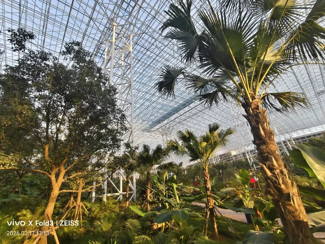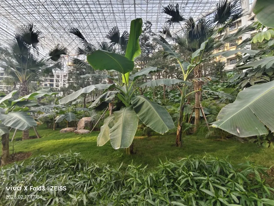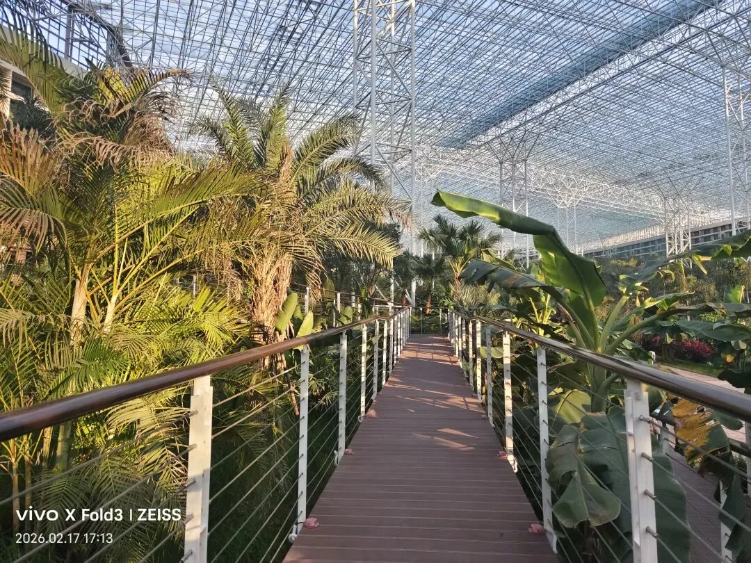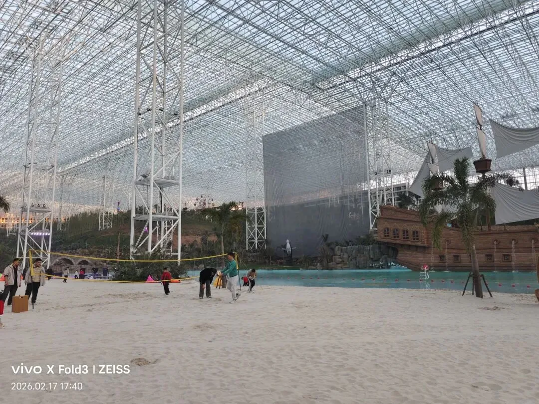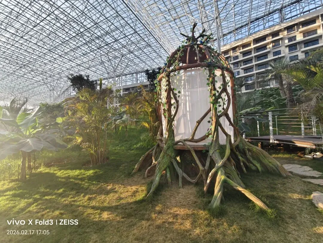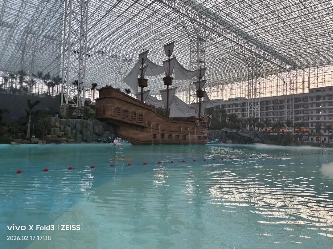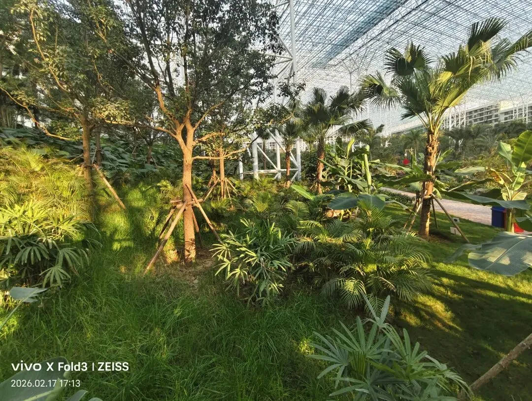 中间有小径通往不同的观赏区。先来到小鸟天堂和恐龙谷。小鸟天堂是一处小小的鸟类乐园。有一条浅浅的细流流过鹅卵石,散养的孔雀一点都不怕人,那只白孔雀优雅的走过来,靠近我,只是我怎么逗它,它都不展开美丽的羽翼。见惯了在地上走动的孔雀,没想到在树木高高的枝丫上还有两个孔雀在栖息。巨大的身形,墨绿色的长长的羽尾在垂落枝丫中间,树木都显得有点袖珍了。 恐龙谷里面有人工做成的恐龙和黑熊。其皮肤和毛发做的很真实,质感很好,加上光电效应,能行动,还能发出巨大的吼声,倒是真的有点吓人的。也引来许多人围观拍照。 景区内有水流由高到低流淌,形成溪流、瀑布和水湾。一路行走,一路水声不绝于耳。木栈道,卵石路和台阶路在园区内蜿蜒,一路行走,听水声,看瀑布,观溪流,是一种非常惬意的感觉。水雾从水面升起,阳光透过玻璃顶棚,照射在水面上,散发着粼粼波光。眼前的一切就形成一副美丽的画面。 雨林里面最吸引目光的还是亚热带植物。这里的亚热带植物特征明显,芭蕉树、滴水观音,植株壮硕,叶子更是宽大厚实。散尾葵,针叶葵,布迪椰子树亭亭玉立,顶端的叶子纤细修长。狐尾椰和大王椰树干高大笔挺,直冲天际。碧绿的铜钱草铺满地面,金边吊兰,棕榈树和红铁树在期间装点。整个园区树木花草种类繁多,从地表到高空,从铜钱草到椰子树,高高低低,错落有致的在整个空间蓬蓬勃勃的生长着。下午的阳光透过玻璃顶棚照射下来,为绿植镀上一抹亮光,让草地、植株、树木都熠熠生辉。 景区西部是一片人工水域和沙滩。白色沙子细腻柔软,踩踏上去非常舒适。池底满铺浅蓝色的防渗膜,所以水面呈浅蓝色,与白色的沙滩,沙滩上五颜六色的躺椅,椰子树和遮阳棚,构成一副海滨模样。也许在夏日里,在沙滩上的躺椅上躺上一躺,也是一种不错的感觉呢。水域对面是还有一座大型的海盗船,白色风帆,木制船身,造型古朴,融入此处环境中,出片还是很好的。 沿着蓝色跑道继续向前,有一片缓坡草坪,是一个拍摄婚纱照的好地方。返回回到大门口,这里日气氛浓郁,门口对面是一道红色大门,大门一侧有“福”“禧”“乐”“顺”四个大字,大字下面是:福到吾家,禧到眉梢,乐到开怀,顺到如意。另一侧的红色标牌写着:喜乐,顺遂,旺,如意。美好的祝福,是大家对美好生活的共同期盼。 新的一年来到了,愿我们所求皆如愿,所行皆坦途,多喜乐,长安康!