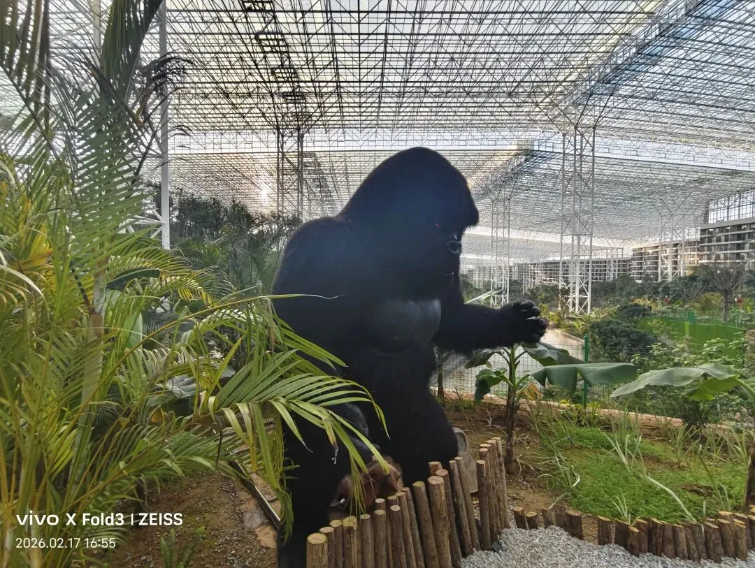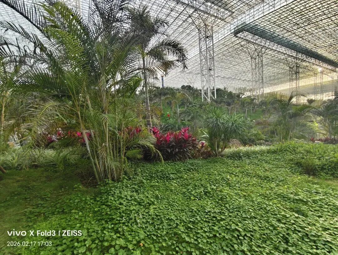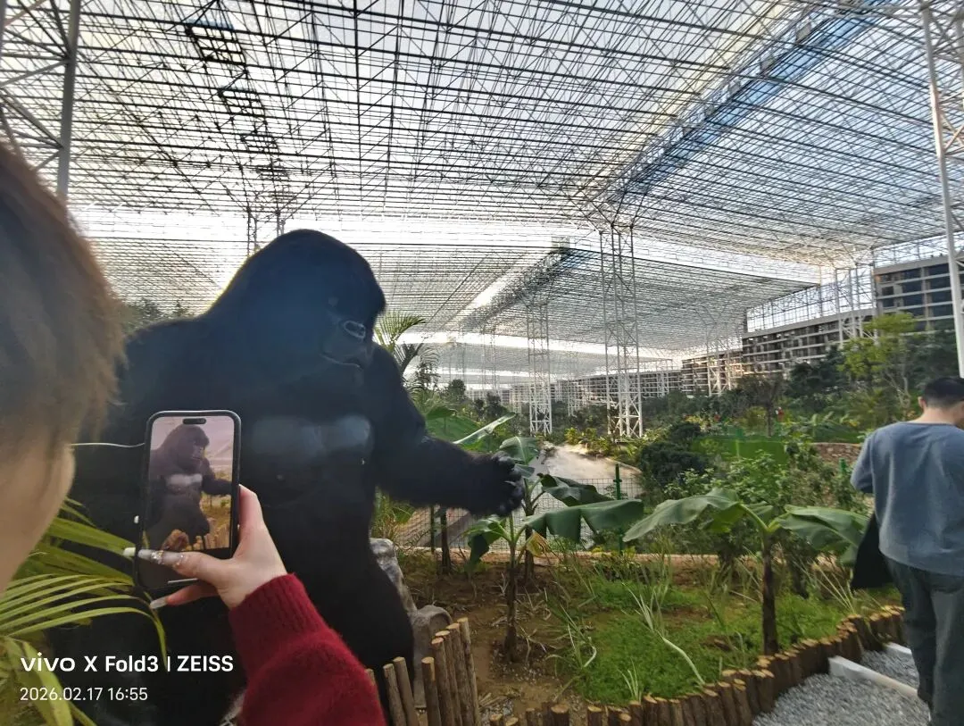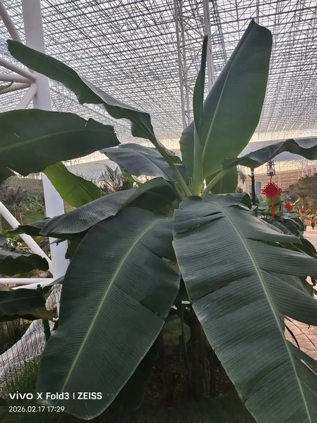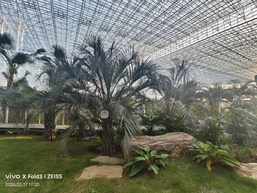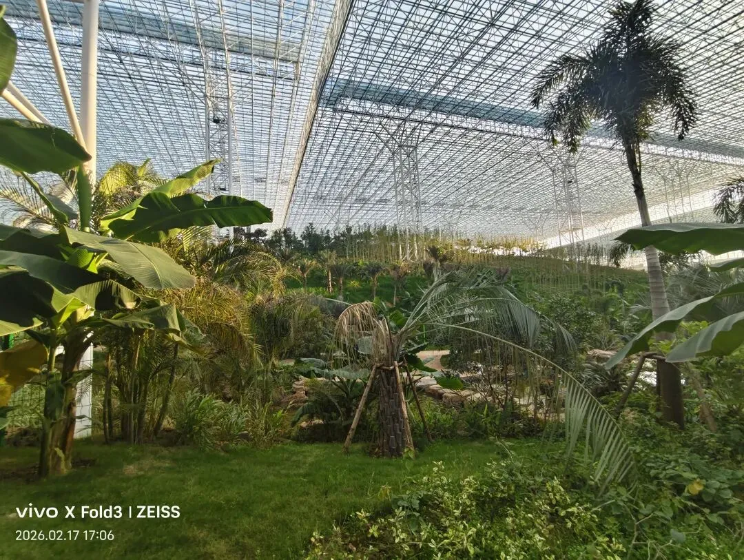 中间有小径通往不同的观赏区。先来到小鸟天堂和恐龙谷。小鸟天堂是一处小小的鸟类乐园。有一条浅浅的细流流过鹅卵石,散养的孔雀一点都不怕人,那只白孔雀优雅的走过来,靠近我,只是我怎么逗它,它都不展开美丽的羽翼。见惯了在地上走动的孔雀,没想到在树木高高的枝丫上还有两个孔雀在栖息。巨大的身形,墨绿色的长长的羽尾在垂落枝丫中间,树木都显得有点袖珍了。 恐龙谷里面有人工做成的恐龙和黑熊。其皮肤和毛发做的很真实,质感很好,加上光电效应,能行动,还能发出巨大的吼声,倒是真的有点吓人的。也引来许多人围观拍照。 景区内有水流由高到低流淌,形成溪流、瀑布和水湾。一路行走,一路水声不绝于耳。木栈道,卵石路和台阶路在园区内蜿蜒,一路行走,听水声,看瀑布,观溪流,是一种非常惬意的感觉。水雾从水面升起,阳光透过玻璃顶棚,照射在水面上,散发着粼粼波光。眼前的一切就形成一副美丽的画面。 雨林里面最吸引目光的还是亚热带植物。这里的亚热带植物特征明显,芭蕉树、滴水观音,植株壮硕,叶子更是宽大厚实。散尾葵,针叶葵,布迪椰子树亭亭玉立,顶端的叶子纤细修长。狐尾椰和大王椰树干高大笔挺,直冲天际。碧绿的铜钱草铺满地面,金边吊兰,棕榈树和红铁树在期间装点。整个园区树木花草种类繁多,从地表到高空,从铜钱草到椰子树,高高低低,错落有致的在整个空间蓬蓬勃勃的生长着。下午的阳光透过玻璃顶棚照射下来,为绿植镀上一抹亮光,让草地、植株、树木都熠熠生辉。 景区西部是一片人工水域和沙滩。白色沙子细腻柔软,踩踏上去非常舒适。池底满铺浅蓝色的防渗膜,所以水面呈浅蓝色,与白色的沙滩,沙滩上五颜六色的躺椅,椰子树和遮阳棚,构成一副海滨模样。也许在夏日里,在沙滩上的躺椅上躺上一躺,也是一种不错的感觉呢。水域对面是还有一座大型的海盗船,白色风帆,木制船身,造型古朴,融入此处环境中,出片还是很好的。 沿着蓝色跑道继续向前,有一片缓坡草坪,是一个拍摄婚纱照的好地方。返回回到大门口,这里日气氛浓郁,门口对面是一道红色大门,大门一侧有“福”“禧”“乐”“顺”四个大字,大字下面是:福到吾家,禧到眉梢,乐到开怀,顺到如意。另一侧的红色标牌写着:喜乐,顺遂,旺,如意。美好的祝福,是大家对美好生活的共同期盼。 新的一年来到了,愿我们所求皆如愿,所行皆坦途,多喜乐,长安康!
