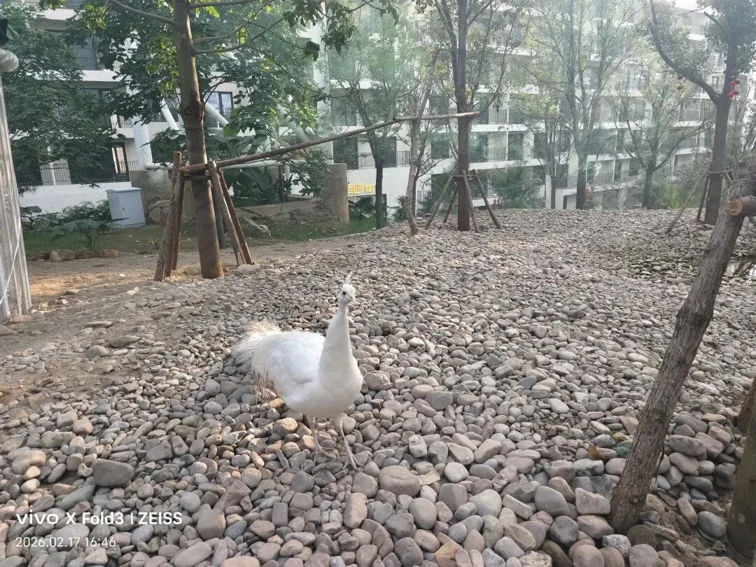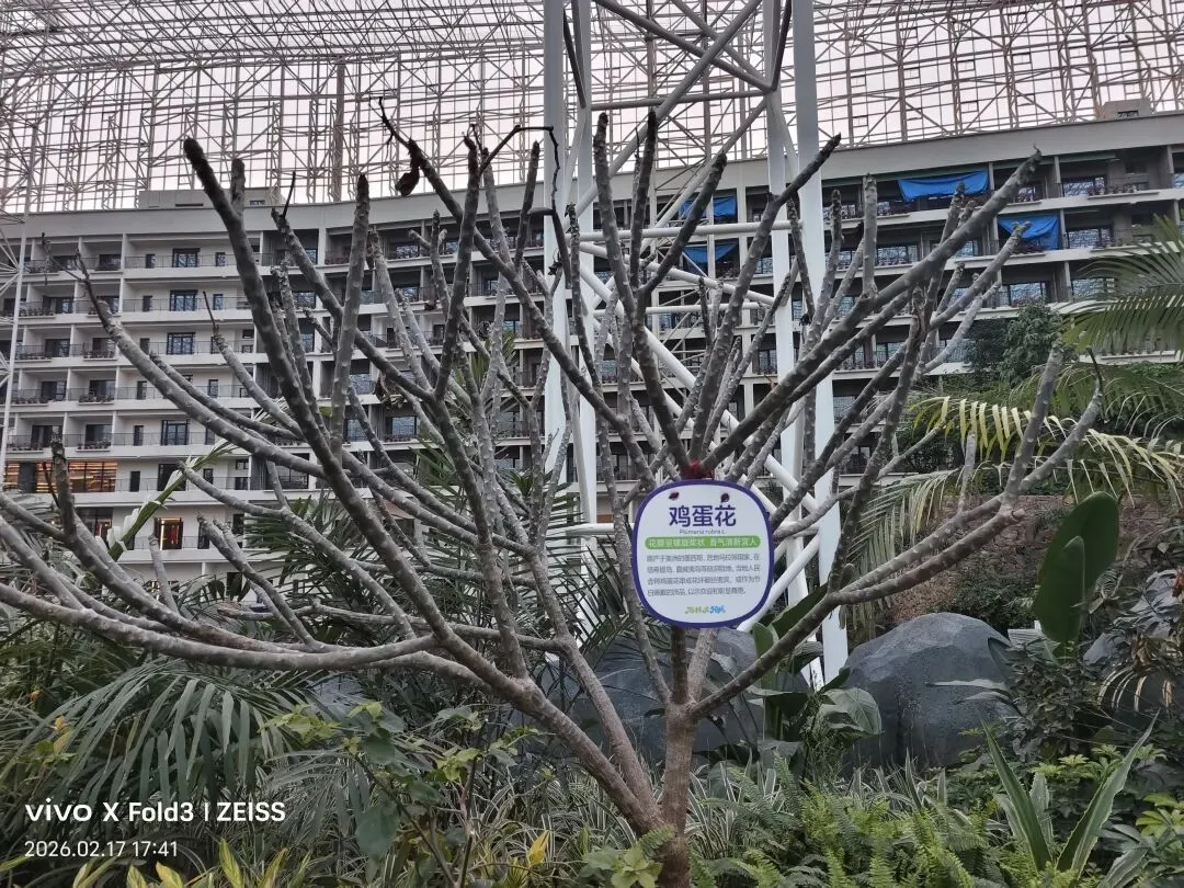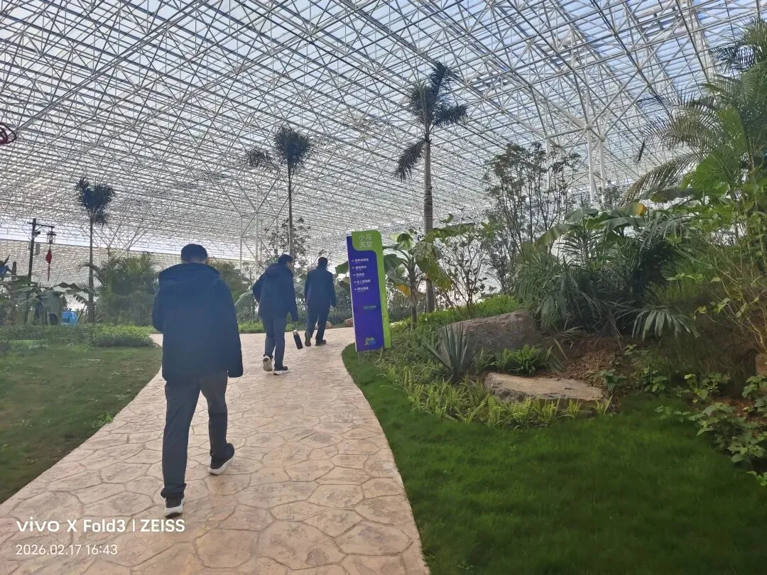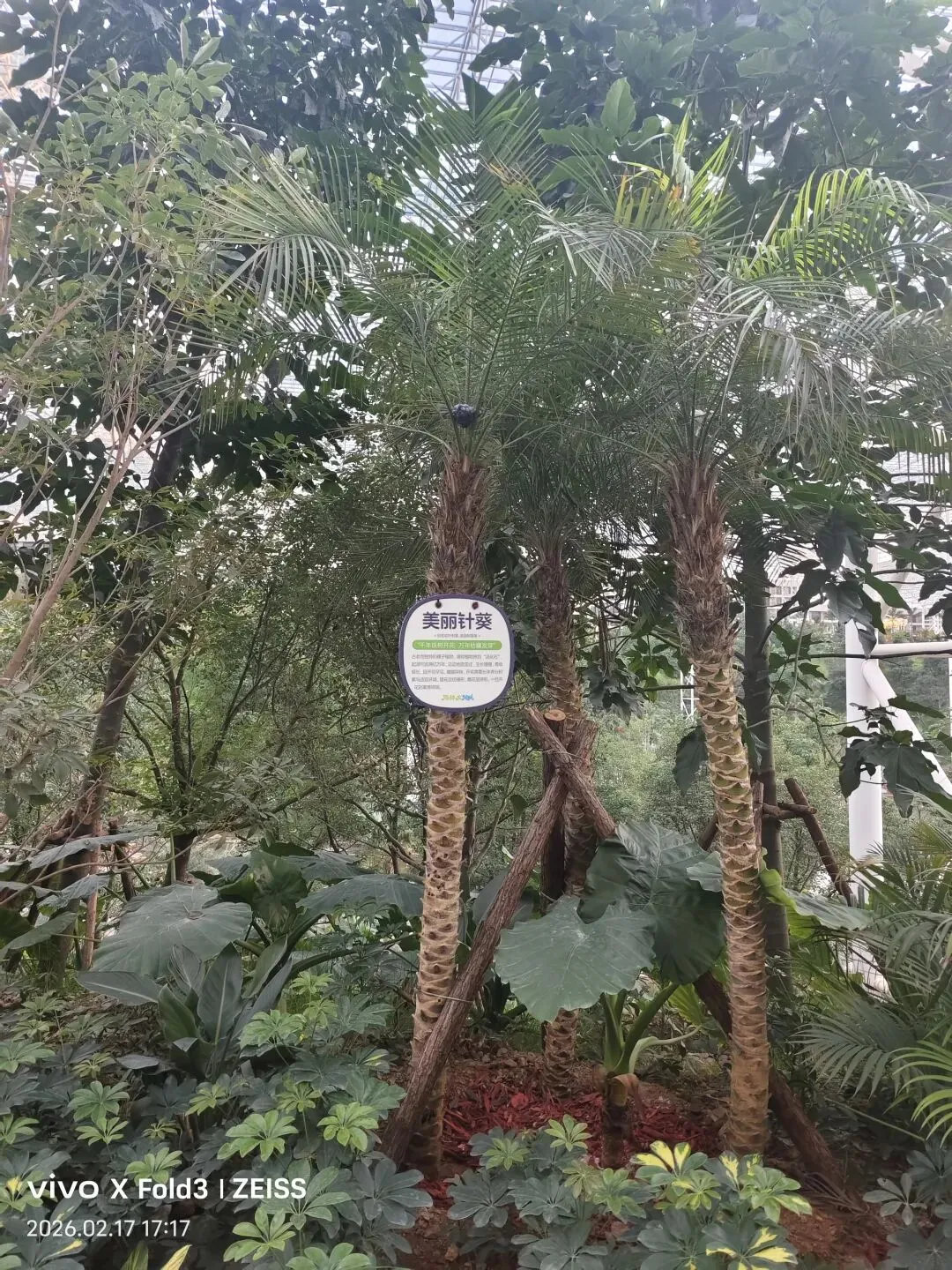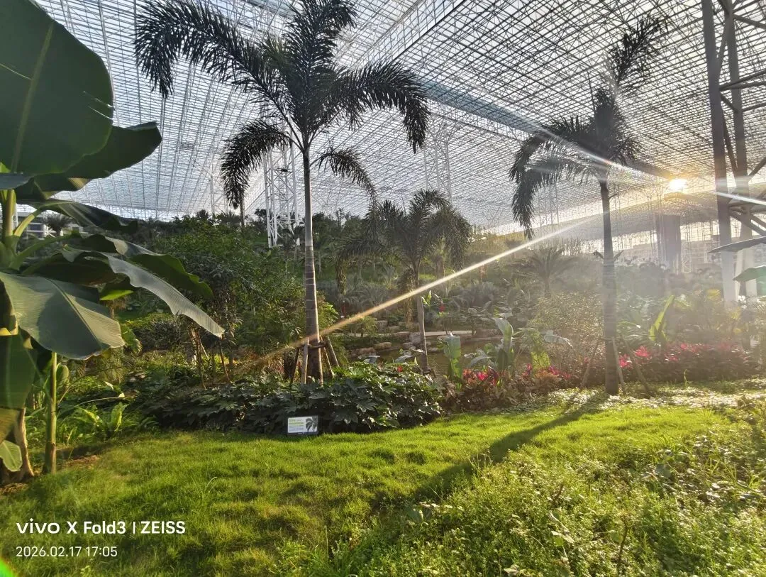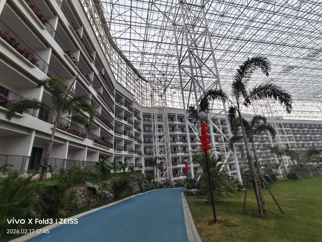 中间有小径通往不同的观赏区。先来到小鸟天堂和恐龙谷。小鸟天堂是一处小小的鸟类乐园。有一条浅浅的细流流过鹅卵石,散养的孔雀一点都不怕人,那只白孔雀优雅的走过来,靠近我,只是我怎么逗它,它都不展开美丽的羽翼。见惯了在地上走动的孔雀,没想到在树木高高的枝丫上还有两个孔雀在栖息。巨大的身形,墨绿色的长长的羽尾在垂落枝丫中间,树木都显得有点袖珍了。 恐龙谷里面有人工做成的恐龙和黑熊。其皮肤和毛发做的很真实,质感很好,加上光电效应,能行动,还能发出巨大的吼声,倒是真的有点吓人的。也引来许多人围观拍照。 景区内有水流由高到低流淌,形成溪流、瀑布和水湾。一路行走,一路水声不绝于耳。木栈道,卵石路和台阶路在园区内蜿蜒,一路行走,听水声,看瀑布,观溪流,是一种非常惬意的感觉。水雾从水面升起,阳光透过玻璃顶棚,照射在水面上,散发着粼粼波光。眼前的一切就形成一副美丽的画面。 雨林里面最吸引目光的还是亚热带植物。这里的亚热带植物特征明显,芭蕉树、滴水观音,植株壮硕,叶子更是宽大厚实。散尾葵,针叶葵,布迪椰子树亭亭玉立,顶端的叶子纤细修长。狐尾椰和大王椰树干高大笔挺,直冲天际。碧绿的铜钱草铺满地面,金边吊兰,棕榈树和红铁树在期间装点。整个园区树木花草种类繁多,从地表到高空,从铜钱草到椰子树,高高低低,错落有致的在整个空间蓬蓬勃勃的生长着。下午的阳光透过玻璃顶棚照射下来,为绿植镀上一抹亮光,让草地、植株、树木都熠熠生辉。 景区西部是一片人工水域和沙滩。白色沙子细腻柔软,踩踏上去非常舒适。池底满铺浅蓝色的防渗膜,所以水面呈浅蓝色,与白色的沙滩,沙滩上五颜六色的躺椅,椰子树和遮阳棚,构成一副海滨模样。也许在夏日里,在沙滩上的躺椅上躺上一躺,也是一种不错的感觉呢。水域对面是还有一座大型的海盗船,白色风帆,木制船身,造型古朴,融入此处环境中,出片还是很好的。 沿着蓝色跑道继续向前,有一片缓坡草坪,是一个拍摄婚纱照的好地方。返回回到大门口,这里日气氛浓郁,门口对面是一道红色大门,大门一侧有“福”“禧”“乐”“顺”四个大字,大字下面是:福到吾家,禧到眉梢,乐到开怀,顺到如意。另一侧的红色标牌写着:喜乐,顺遂,旺,如意。美好的祝福,是大家对美好生活的共同期盼。 新的一年来到了,愿我们所求皆如愿,所行皆坦途,多喜乐,长安康!