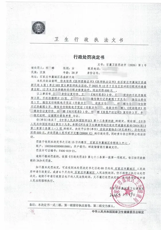 本机关依法查明,你未取得《医师资格证书》《医师执业证书》在石家庄市藁城区昌盛新天地A座1单元503室从事医师执业活动,于2025年12月7日为王亚冲进行眼周肉毒毒素注射、12月8日为李晓玲进行眼皮修复治疗,违法所得600元。