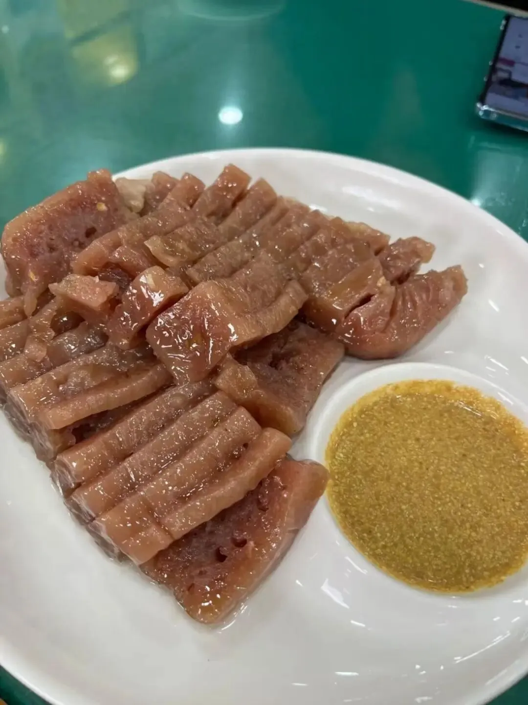 深泽县的西河肉糕,堪称庄里的“肉食者天堂”。作为当地“美食三绝”之首,这道百年小吃以红薯淀粉混合驴肉碎蒸制而成,成品红亮弹润,“肉中有糕、糕中有肉”。凉透后切薄片,蘸上蒜泥醋汁,弹滑不腻,肉香醇厚,夹在烧饼里,便是妥妥的“庄里版驴肉汉堡”,无论是宴席待客,还是日常佐餐,都是绝佳选择 。
