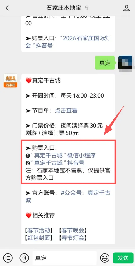 ✅购票入口:“真定千古城”微信小程序。也可关注【石家庄本地宝】公众号,私信回复【真定】,即可获取购票入口(注:石家庄本地宝不售票,仅提供官方购票入口,下同)