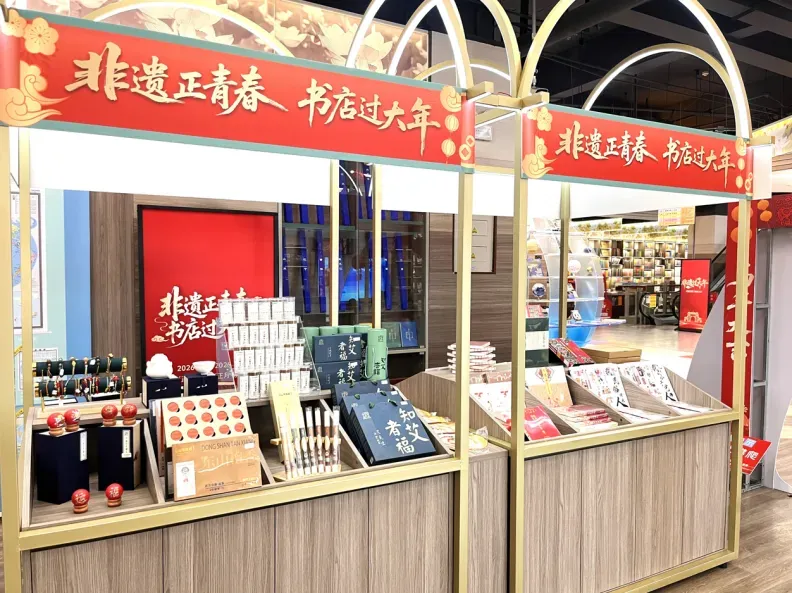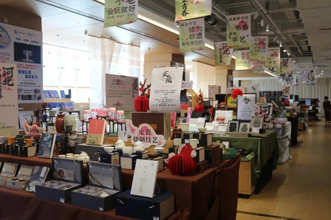 位于中山路与建设大街交叉口的石家庄书城也装扮一新。一楼大厅内,非遗体验市集即将热闹开张——葫芦烙画、面人、糖画、合香珠、剪纸、武强年画、螺钿、唐山皮影、雕版印刷、藁城宫灯、金石传拓等非物质文化遗产代表性项目齐聚。