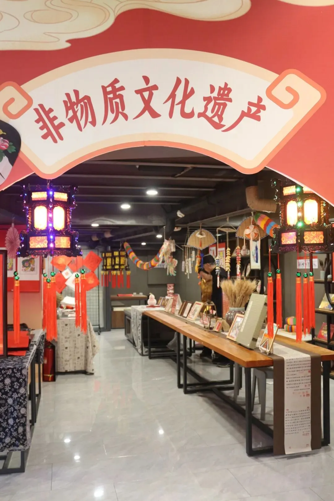 印满福字的葫芦造型小夜灯,光影流转,既是新春氛围好物,也是匠心文创礼品。实木相框民俗装饰画、新春礼盒文创等,兼具装饰与礼赠属性,契合年轻群体的新春消费需求。红金花艺、折扇金花等极具氛围的布置,与非遗展品相得益彰。