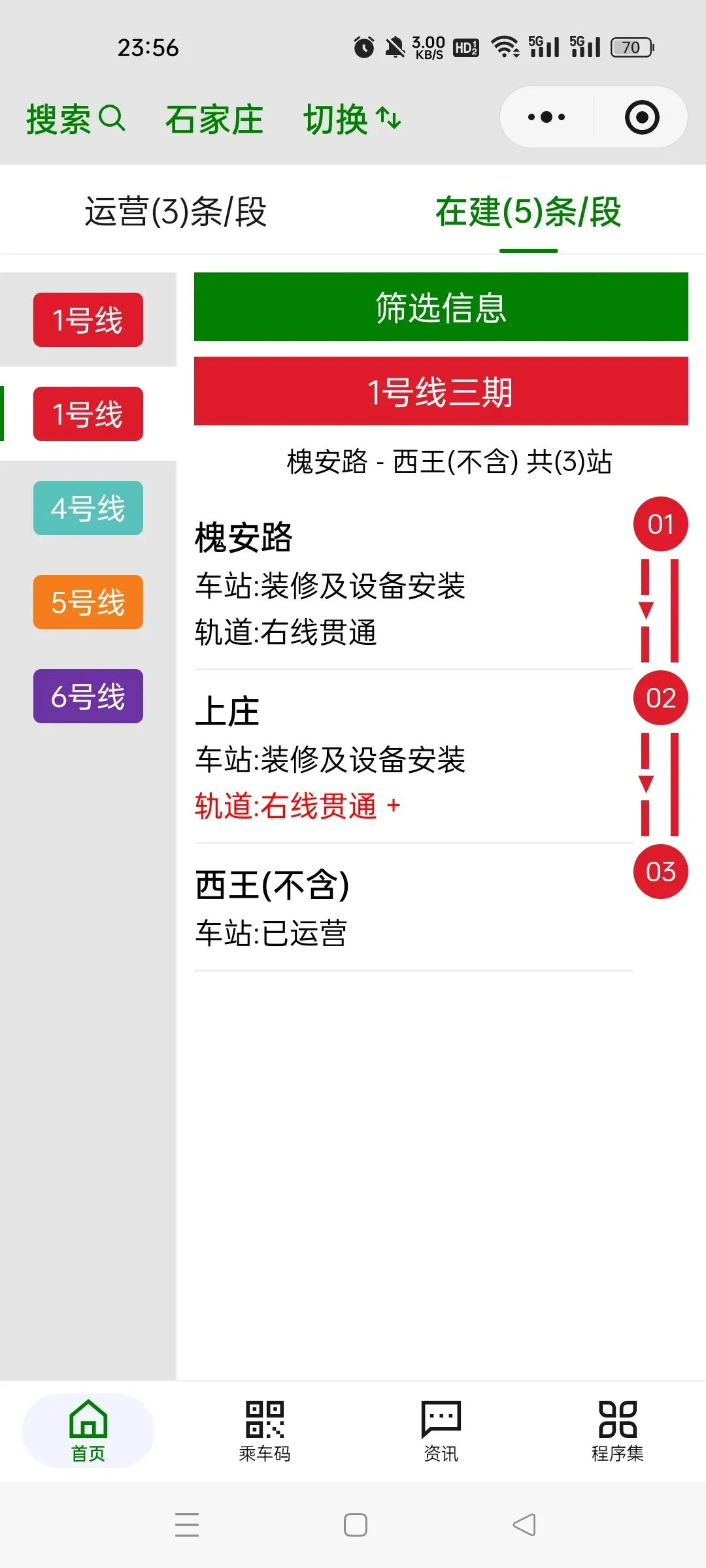 1号线三期(槐安路-西王),计划开通时间:2027年。3座地下车站中,1座已开通,2座已封顶,其中2座装修及设备安装;4个轨行区间中,2个已贯通,2个土建施工。