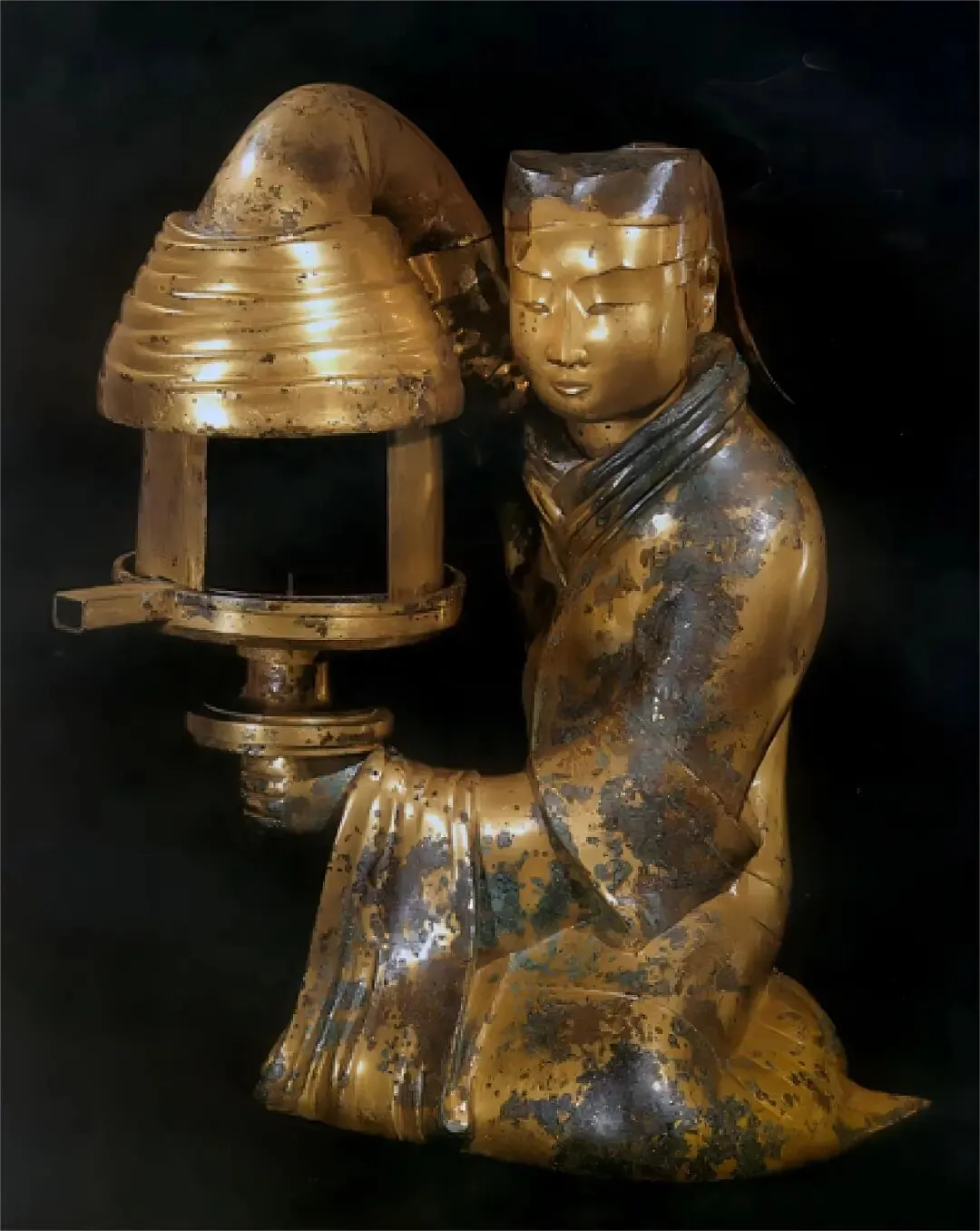 西汉满城汉墓窦绾墓出土,通体鎏金,通高48厘米,为宫女跽坐执灯造型,被誉为“中华第一灯”。灯体设计极具巧思,宫女右臂为中空烟道,燃烧产生的烟尘可通过袖管导入灯体,经底部清水过滤,实现无烟环保照明;灯盘可旋转、灯罩可开合,自由调节光照方向与亮度。器身刻有“长信尚浴”等65字铭文,记录其宫廷流转历史,集实用、美学、历史价值于一身。