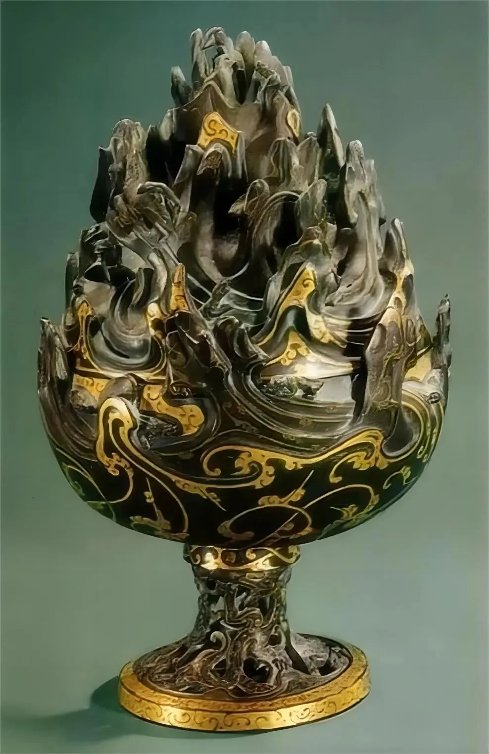 西汉满城汉墓刘胜墓出土,高26厘米,为青铜错金工艺巅峰之作。炉盖铸出层叠起伏的仙山造型,山间雕刻虎豹、猿猴、猎人等生动纹饰;错金线条流畅华丽,焚香时烟气从山峦孔隙缓缓溢出,宛若云雾缭绕的海上仙山,意境绝美,是汉代神仙思想与顶级冶金工艺的完美结合。